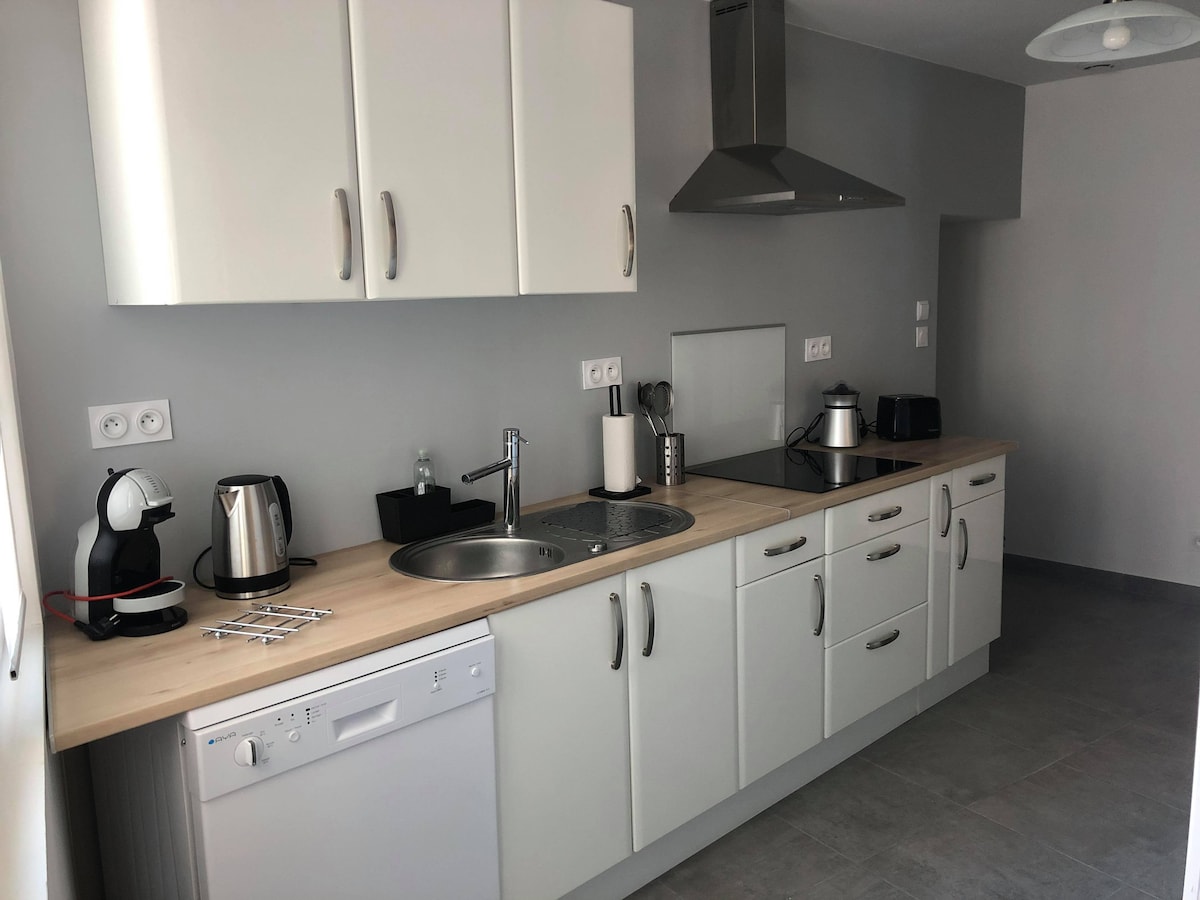 Բարի գալուստ «Aux Allies »՝ լողափից ընդամենը 40 մետր հեռավորության վրա, քնած է 4 և, հնարավոր է, լրացուցիչ երեխա Լիովին վերանորոգված և ճաշակով ձևավորված ձկնորսի տուն ՝ այն ունի լիովին կահավորված բաց խոհանոց (ջեռոց, միկրոալիքային վառարան, սառնարան, ամանալվաց մեքենա, սրճեփ, թեյնիկ, տոստեր...), որտեղից բացվում է տաք բնակելի տարածք ։ Ապակե լայն պատուհանը թույլ է տալիս ուղղակիորեն մուտք գործել դեպի կտուր և մեծ հարավում գտնվող այգի ։ Ըստ ցանկության ՝ սպիտակեղեն