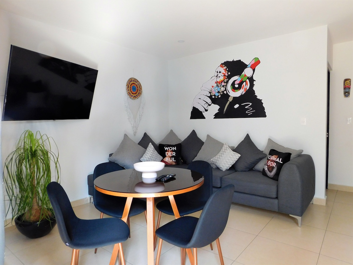 Ժամանակակից և հարմարավետ մեկ ննջասենյակով բնակարան/ստուդիա, մեկ զուգարան և մեկ այլ կես լոգասենյակ, բաց խոհանոց և հյուրասենյակ ՝ բազմոցով և գրասեղանով, նոր շենքում ՝ Կոլոնիա դել Վալե Սենտրոյում ։ __________________________________ Ժամանակակից և հարմարավետ ստուդիական բնակարան ՝ մեկ ննջասենյակով, զուգարանով, մեկ այլ կիսալոգարանով, հյուրասենյակի տարածքով ՝ բազմոցով և գրասեղանով, բաց խոհանոցով, նոր շենքում, որը գտնվում է Կոլոնիա դել Վալե կենտրոնում ՝ կենտրոնական և ռազմավարական դիրքով ։