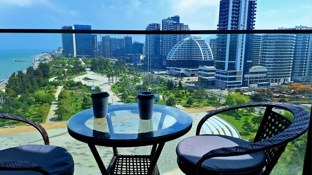 Boho-style studio in the historical center of Batumi — Porta Batumi Tower - Panoramic windows with a breathtaking view of the sea, mountains, and city - Bathtub! - Perfect cleanliness and freshness! - Excellent soundproofing! - Warm floors! - Many elevators that work without delays Nearby: - The Sea, Old Town, Europe Square, boulevard, restaurants and cafes are just 5 minutes away - Supermarkets, pharmacies, hookah bars and bars are nearby - Convenient parking near the house