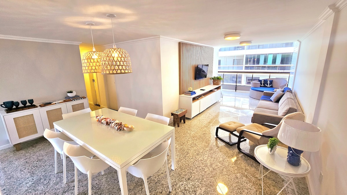 Apartamento amplo com 01 varanda de frente ao mar na orla da praia do morro para até 10 pessoas composto de 1suite com ar TV secador de cabelo 1 quarto de casal com ar TV 1 quarto de solteiro com ar TV 2 camas e colchões a partir 3 banheiro com secador de cabelo sala com sofá retrátil TV 65 polegadas e com todos os canais e maguina de lavar roupas filmes liberados com Wifi tntrolr odo montado com roupas de camas e toalhas 2 vagas de garagems com controle remoto maquina de lavar roupas