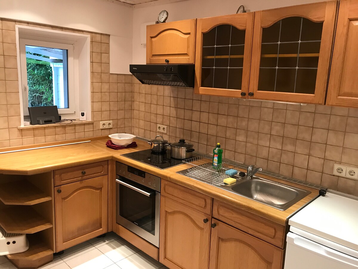 30qm Wohnung in saniertem Zweifamilienhaus Eingangsbereich Hauptraum 1,60m Bett, Couch (mit Schlaffunktion in 1,30m Breite), Esstisch als Anrichte ausgeführt Küche voll ausgestattet (Premium Geräte, Kaffee, Tee, Trinkschoki for free) gegenüber Doppel-Waschtisch links davon Eingang zur offenen Regen-Dusche rechts davon Toilette (abschließbare Tür) el. Rolläden Hauptraum & Klo Plissees an allen Fenstern Fahrzeug(e) kann direkt vorm Grundstück geparkt werden (Sackgasse)! Hof noch nicht saniert