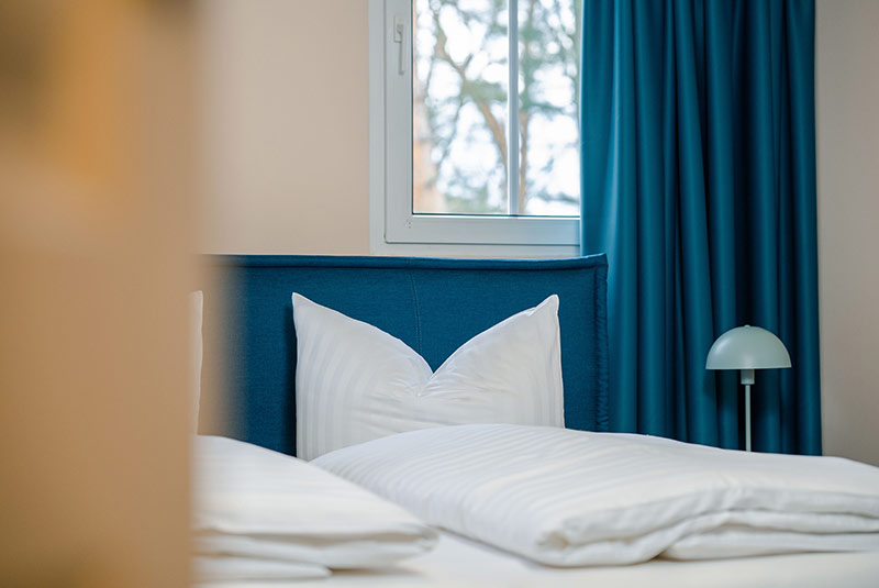 The modern, bright, friendly 12 m² single rooms were all newly furnished in 2022. The ambience convinces with functionality and cosiness, which tempt to a relaxed pastime. All single rooms are equipped with an en-suite shower room. A safe, a minibar, an electric kettle, a desk, a chest of drawers, a small closet or a wardrobe are part of the equipment. Single bed 1.00 m. Mattress 0.90
