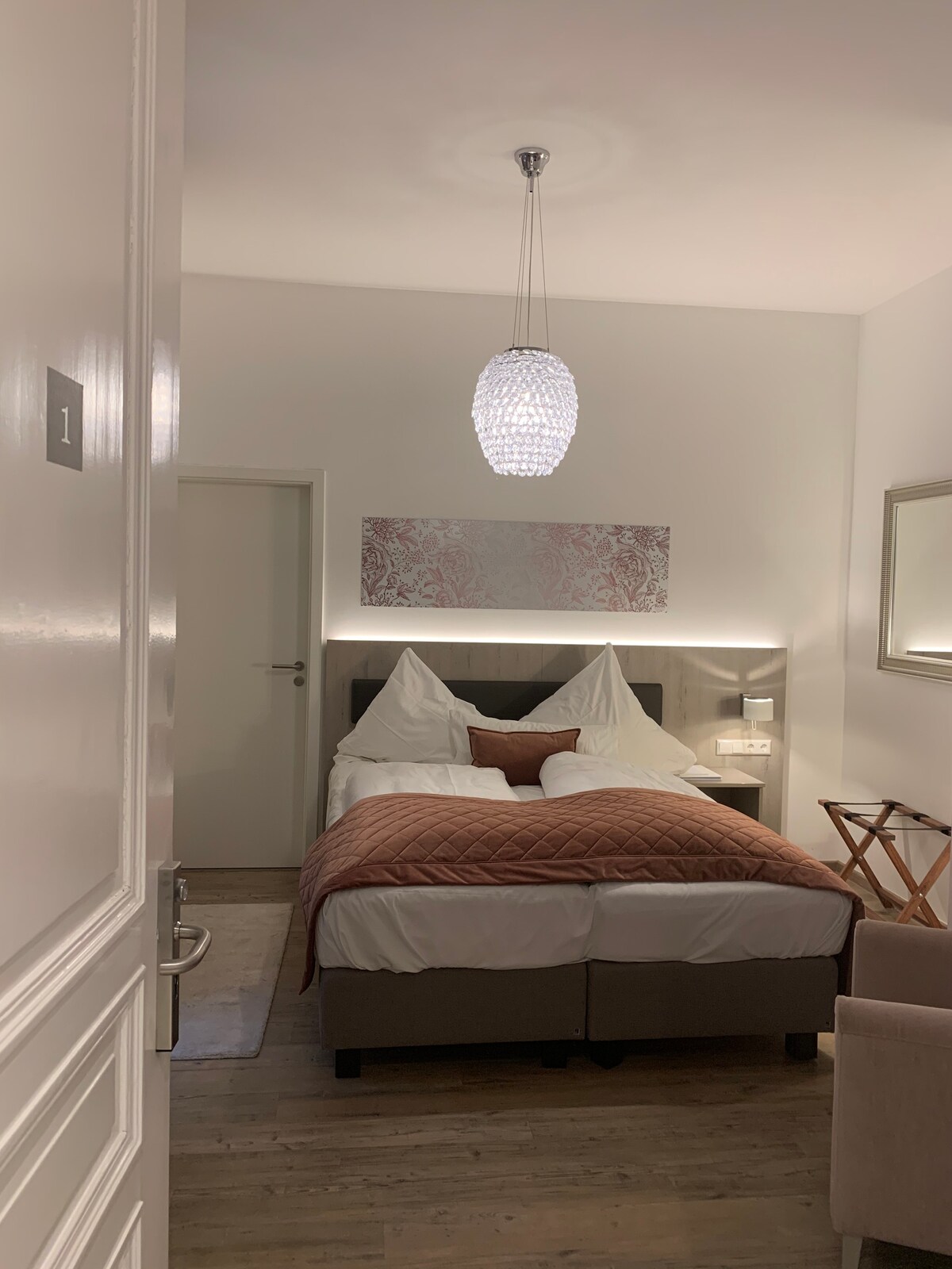 Մեր ռոմանտիկ երկտեղանոց սենյակները գտնվում են մեր պատմական գլխավոր շենքում ՝ հին քաղաքի տեսարանով, ինչպես նաև հիմնական շենքի ավելի հանգիստ հետևի մասում կամ արդիականացված հավելվածում: Զգեստապահարանի կամ պահարանի վրա ձեզ հետ բերված բոլոր հագուստի համար տեղ կա զգեստապահարանի կամ պահարանի համար ։ Վարսահարդարիչով լվացարանը գտնվում է սենյակում, ցնցուղը և զուգարանը ՝ սենյակից առանձին ։ Ջերմաստիճանը կարգավորվում է առանձին երկու սենյակներում: Սենյակներում կա հեռուստացույց ։