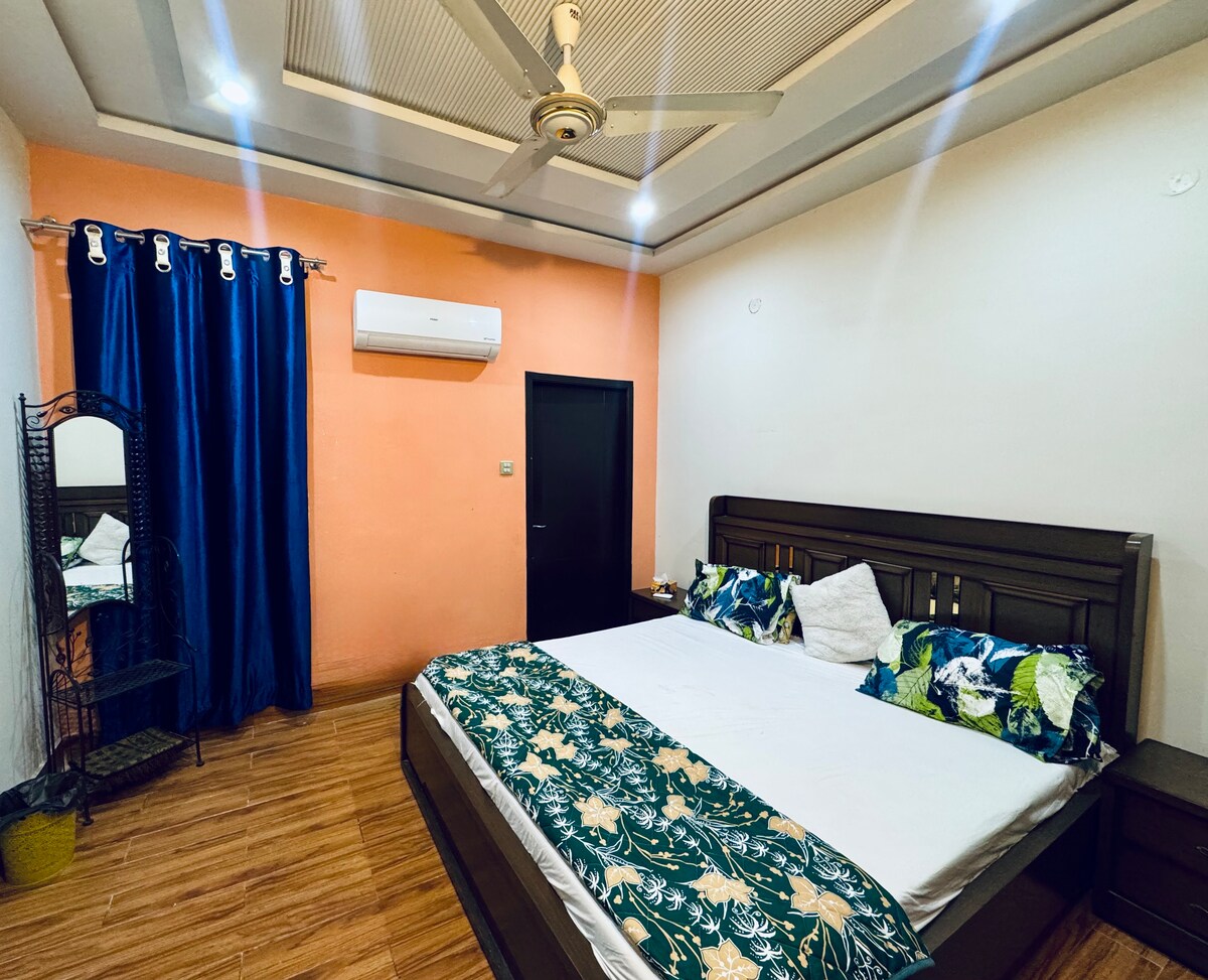Spacious 1BR ground floor portion near Multan Northern Bypass with no stairs, fast Wi-Fi, free parking, and full AC. Perfect for business travelers, families, and medical tourists needing easy access. Independent entrance, full kitchen, 24/7 security, power backup, and smart TV. Direct parking access, extra living space, and proximity to airport and Nishtar Hospital. Self check-in, instant book available. Your convenient Multan base awaits!