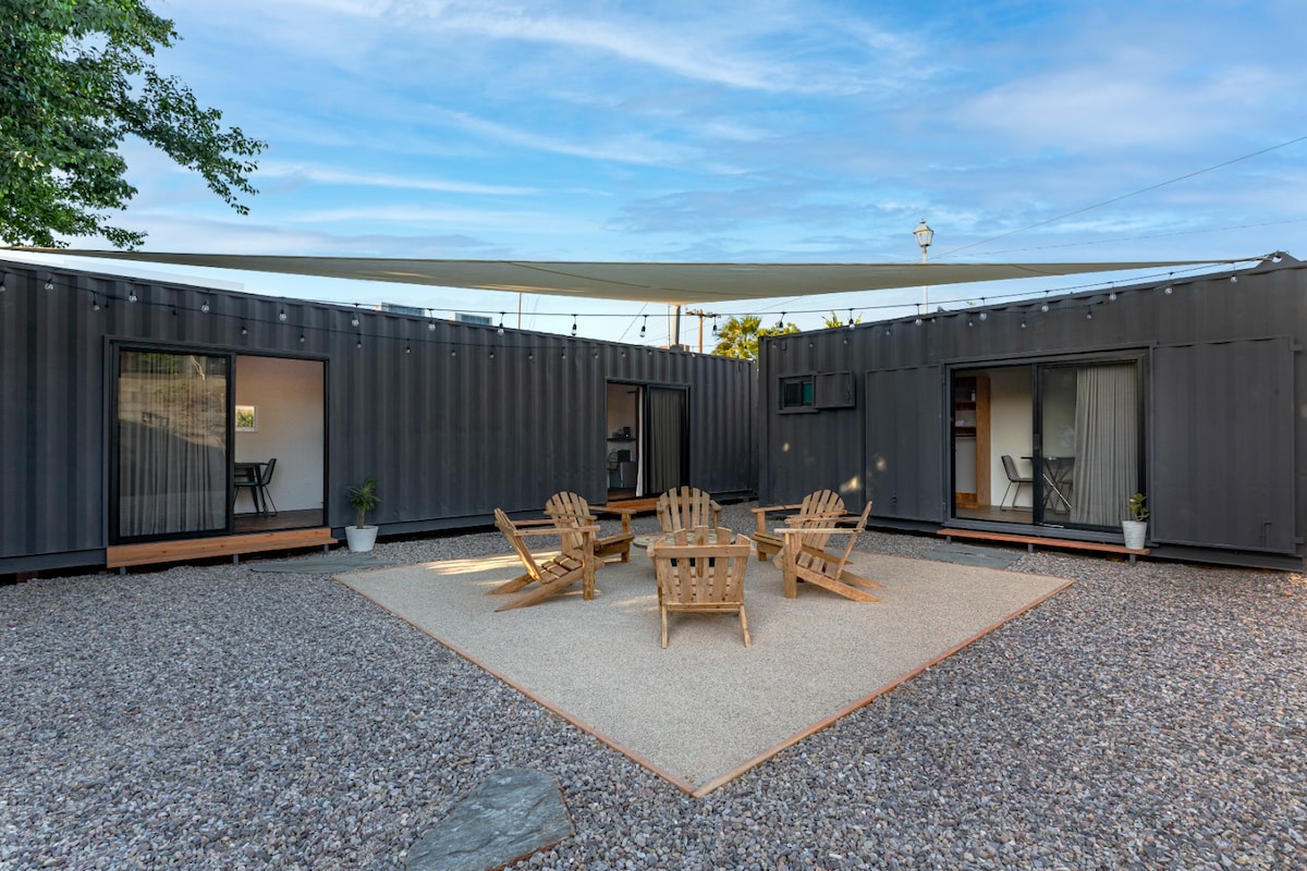Welcome to 20-30 Knots, a sophisticated 5br/4bath repurposed shipping container eco-property (two adjoining homes) designed for game nights, adventure and relaxation. 20 Knots: 2 bedrooms with king-sized beds, 1 bath, large decks with a firepit hammock and daybed all overlooking breathtaking views. 30 Knots: 3 bedrooms, king-sized beds, 3 baths, 8 person hot tub, retro video games, shuffleboard, spacious decks with firepits, outdoor seating areas, hammocks & complimentary guest storage locker.
