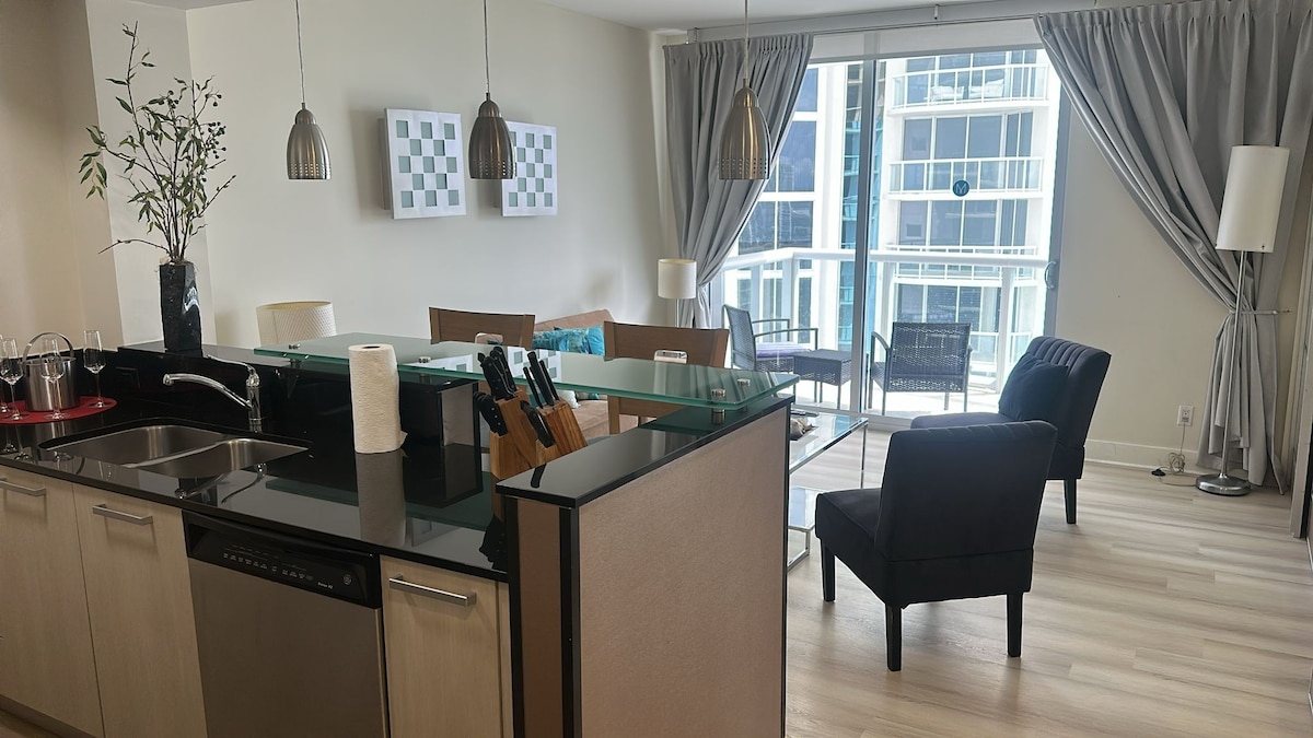 Փորձեք Մայամիի հարմարավետությունը մեր նորաոճ Բեյ Հարբոր կղզիների բնակարանում, որն ունի հատակից մինչև առաստաղ պատուհաններ, բաց բնակելի տարածք և առանձին պատշգամբ ։ Այս 2 ննջասենյակով, 2 լոգասենյակով հանգիստը ներառում է լրացուցիչ հյուրերի համար նախատեսված երկտեղանի բազմոց, պրեմիում անկողնային պարագաներ և համեղ դեկոր ։ Կատարյալ է ընտանիքների կամ զույգերի համար, կարող եք հեշտությամբ օգտվել կուսական լողափերից, Բալ Հարբոր խանութներից, նրբաճաշակ ճաշկերույթներից և Մայամիի լավագույն տեսարժան վայրերից ։ Հարմարավետություն, ճկունություն և հարմարավետություն մեկում ։ Բացարձակապես ոչ մի երեկույթ չի թույլատրվում ։