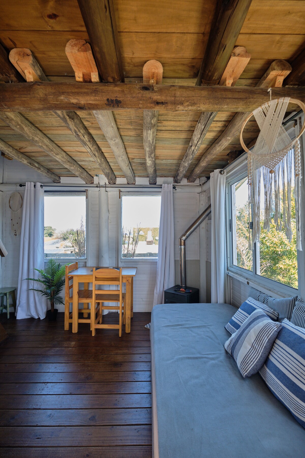 • Cozy cabin ideal for families and friends. • Year-round relaxation: summer paradise, winter retreat. • Queen bed and 2 comfortable twin beds for restful sleep. • Charming wood-burning stove and AC for comfort. • Fully equipped kitchen for delightful meals. • TV and Wi-Fi for entertainment and connection. • Pristine oceanic sand beach steps away for long walks and days of relaxation. • Terraces and stunning ocean views. • Explore attractions and activities in Punta del Este. Book now!