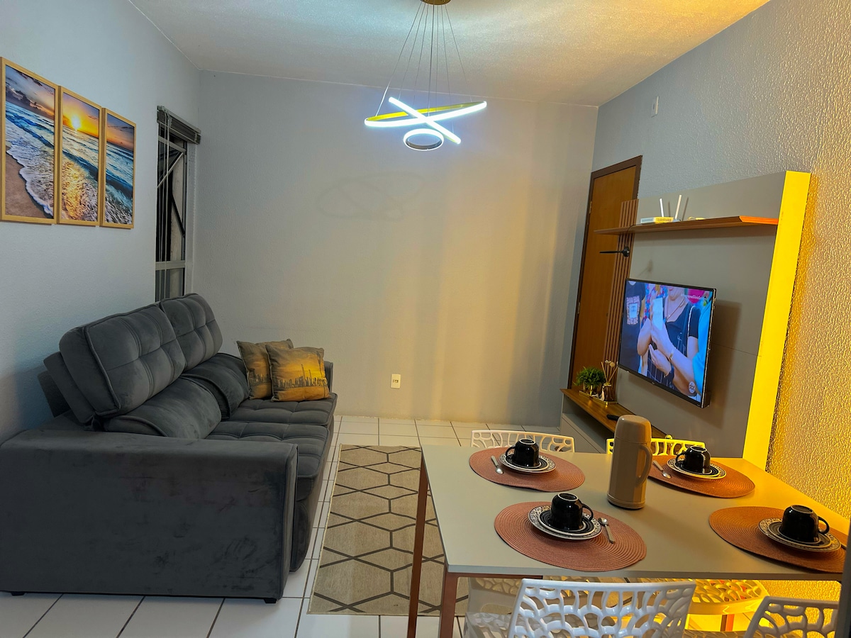 O apartamento fica a 100 mts da praia. Lindo apartamento tem TV parabólica, três ar condicionado quente e frio nos dois quartos e sala, micro ondas, forno elétrico , churrasqueira, geladeira, máquina de lavar enfim completo. Tem também uma linda sacada que se estende por toda extensão do apartamento ficando de frente para a avenida Brasil. Tem cabeleleiras boutiques etc... um excelente supermercado ao lado do prédio em que está o apartamento. TV na sala e quarto de casal, com crome cast