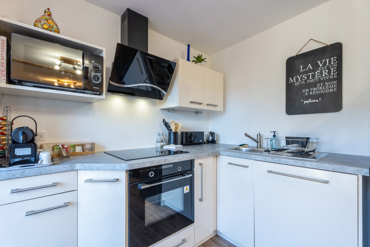 La Suit's Charmes-ը ձեզ ողջունում է ջերմ, հարմարավետ և հանգստացնող միջավայրում։ Երազեք, հանգստացեք, նայեք, զգացեք, գրկեք, գտեք ինքներդ ձեզ, գտեք ինքներդ ձեզ, վստահեք… Սիրեք ինքներդ ձեզ… Եկեք և վայելեք «Համազգեստի հմայքը»!! 75 քմ տարածքով լյուքս, Բելֆորի երկաթուղային կայարան Ջակուզի Սաունա Երկտեղանի մահճակալ 4K սմարթ հեռուստացույց, Netflix, Orange TV Wi - Fi Ներսի բուխարի Աստղալից երկինք Մուլտիհոսող XXL ցնցուղ (ցնցուղի երկինքը դեռևս անհասանելի է) Տրամադրված բոլոր սպիտակեղենները Հնարավոր տարբերակ՝ էրոտիկ ճոճանակ/ շամպայն/ տեխնիկայի երեկույթ