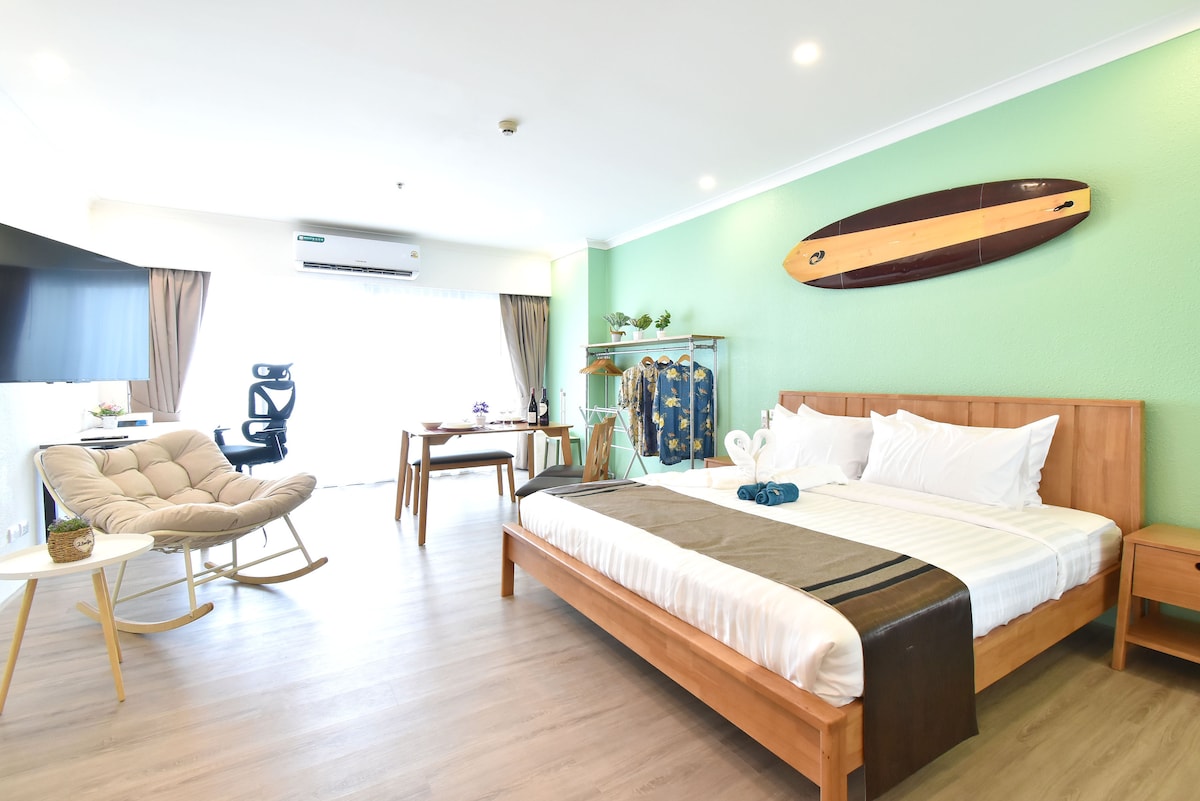 Այս բնակարանը գտնվում է Պատտայա նահանգի Ջոմտիեն Բիչում ՝ լողավազանով և մարզասրահով ։ Եթե ուզում եք թեթև շքեղ և ժամանցային հանգիստ ունենալ Պատտայայում, ես վստահ եմ, որ այս տունը նախ կուղղեմ ձեզ ։ - Անհաղթ տեսարան ՝ ծովափնյա բնակարան ։Ձեր պատուհանից անմիջապես այն կողմ Ջոմտիեն լողափն է, անեզր օվկիանոսը և մայրամուտի մայրամուտները ։Կարող եք նաև վայելել ծովի մայրամուտի ցնցող տեսարան ՝ տանը հանգստանալիս ~ - Աղմկոտ շրջակայք. մոտակայքում գտնվում է աղմկոտ Ջոմտիեն լողափի գիշերային շուկան և բացօթյա մանկական դրախտը, որտեղ կարող եք տեղական սնունդ ուտել ուշ գիշերով ~ - Հարմարավետ փոխադրում. հեշտ մուտք դեպի Պատտայայի ամենուրեք ՝ songthaew - ի միջոցով ։Լողացող շուկա, Թեդդի Բեար թանգարան, Ստորջրյա աշխարհ Պատտայա, Սիամ Կվոկ 8 րոպե, տերմինալ 21 12 րոպե Ծովի տեսարանով այս սենյակը, անշուշտ, խորհուրդ է տրվում ձեզ, ովքեր ցանկանում են գալ Պատտայա ՝ թեթև շքեղ հանգստի և ծովը սիրելու համար:
