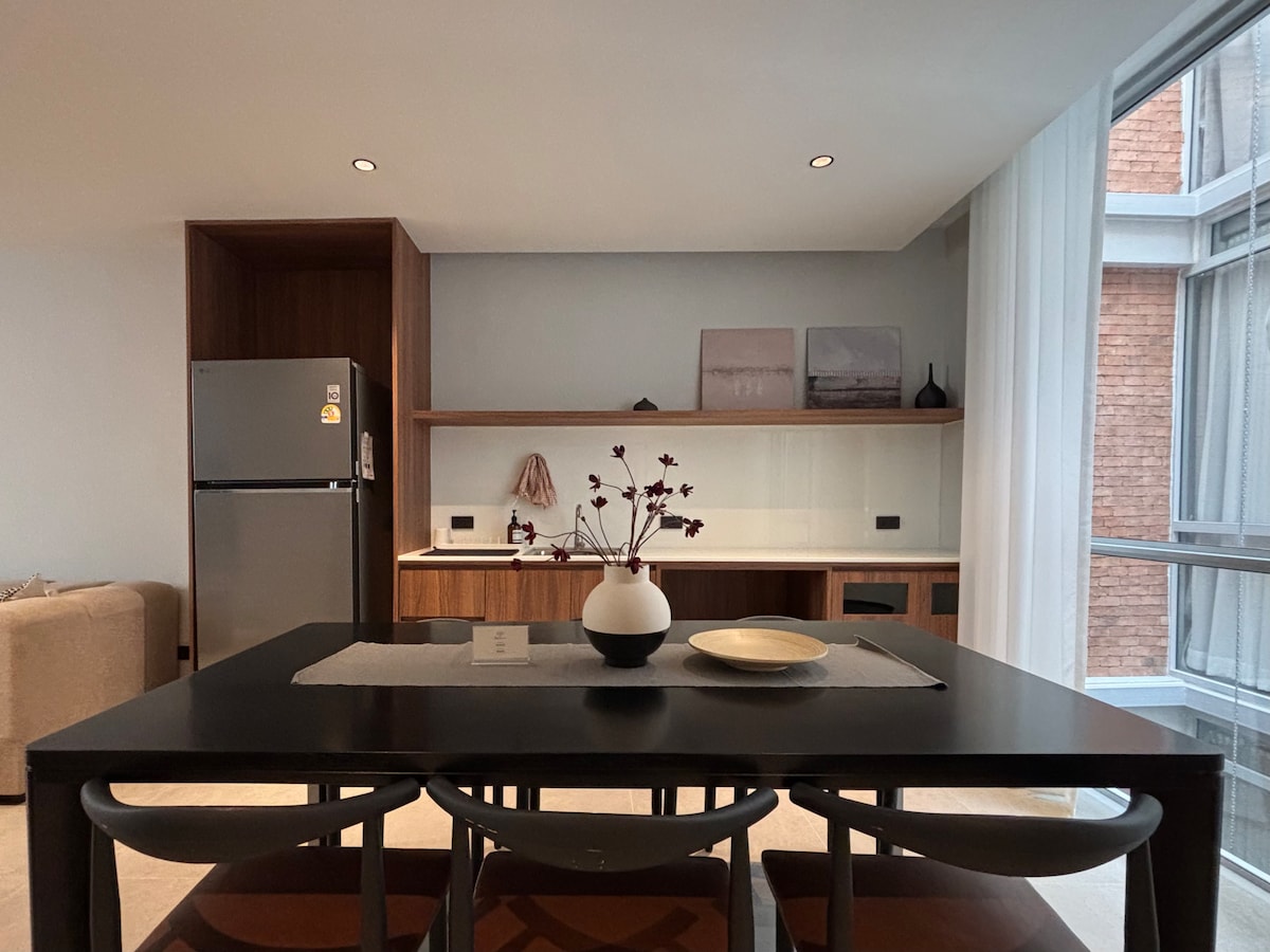 This renovated mid-century home sits on its original grounds, offering a rare green oasis in central Bangkok. With two bedrooms, two bathrooms, a living room, and a kitchen, it’s perfect for an ideal of relaxed stay Just a 5-minute walk to Surasak BTS and the pier, it’s great for exploring the old town by ferry. Nearby cafés, restaurants, and a morning market let you grab fresh ingredients or enjoy a true local breakfast. The neighbourhood's is quiet and safe, with key-card access and CCTV added