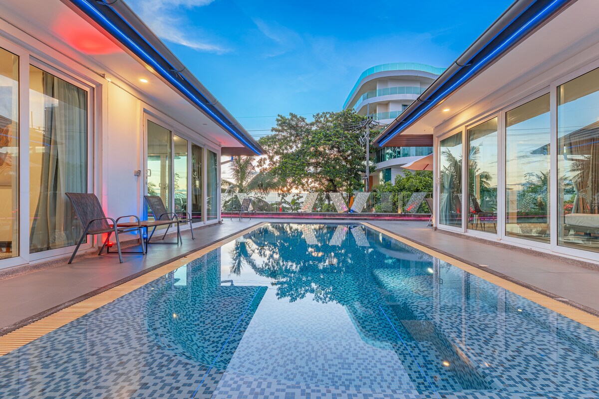 Ժամանակակից վիլլա Պատտայայում ՝ մասնավոր լողավազանով ։ Քայլելու փողոցի մոտ ։ Բաղկացած է 2 ծնողական համարներից ՝ երկտեղանի մահճակալով, յուրաքանչյուրը ՝ իր լոգասենյակով և հանդերձանքով ։ Մեծ հյուրասենյակ, որտեղից բացվում է տախտակամածի տեռաս և լողավազան ՝ առանց վիզայի ։ Խոհանոցը լիովին կահավորված է, գրասենյակային, սոլյարի, 3 Smart TV, գերարագ առանձին և անվճար Wi - Fi: