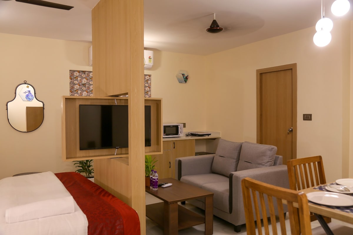Մնացեք ժամանակակից 1BHK սպասարկվող բնակարանում Hitech City - ի մոտակայքում ։ ՏՏ հանգույցներից, Գաչիբովլիից, Մադհապուրից և Ֆինանսական շրջանից ընդամենը մի քանի րոպե հեռավորության վրա ։ Վայելեք հարմարավետ հյուրասենյակ ՝ Wi - Fi - ով և Smart TV - ով, լիովին կահավորված խոհանոցիկով, հարմարավետ ննջասենյակ ՝ պրեմիում սպիտակեղենով, և մաքուր լոգասենյակ ՝ տաք ջրով ։ Իդեալական է բիզնես ուղևորների, ընտանիքների կամ երկարատև այցերի համար ՝ առաջարկելով տան հարմարավետություն հյուրանոցային սպասարկմամբ ։