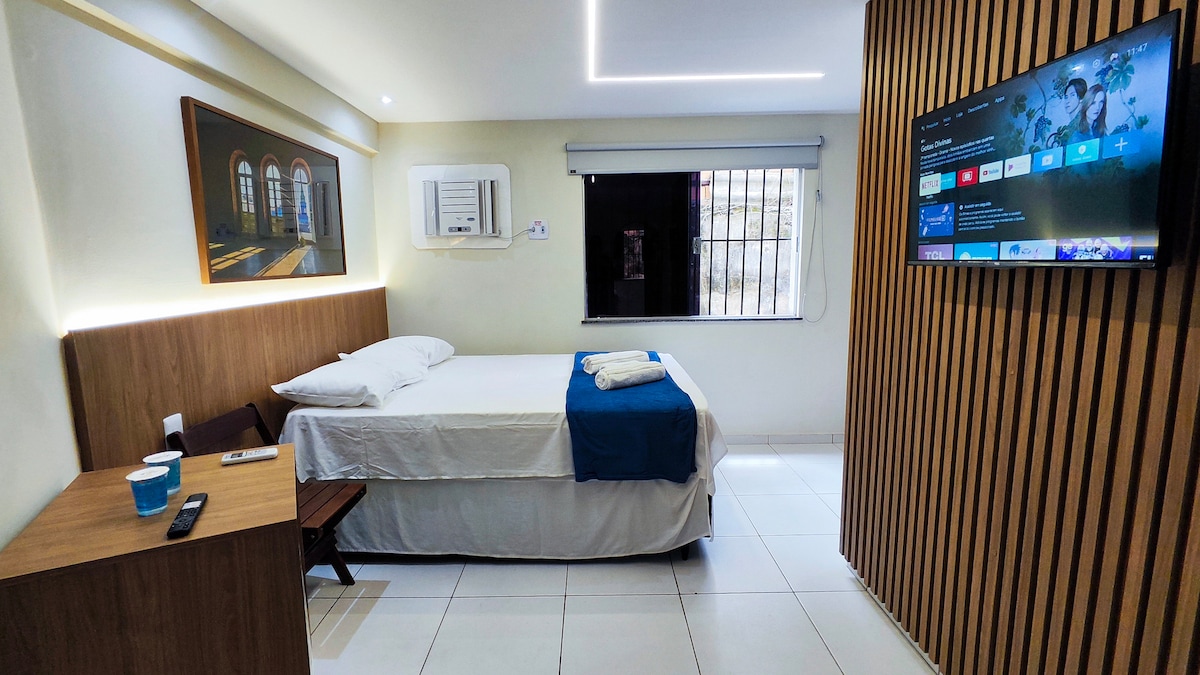 Hospede-se em um espaço novo, acolhedor e cheio de personalidade, no coração do Centro Histórico de Belém. Cada detalhe da decoração típica e do artesanato amazônico reflete a alma vibrante da cidade e convida você a mergulhar na cultura local. • Quarto com cama Queen, ar-condicionado e TV • Cozinha completa e área de jantar • Banheiro moderno e funcional • Wi-Fi veloz e streaming Sinta-se em casa enquanto desfruta da autenticidade, da beleza e do conforto que só a Cidade Velha pode oferecer.