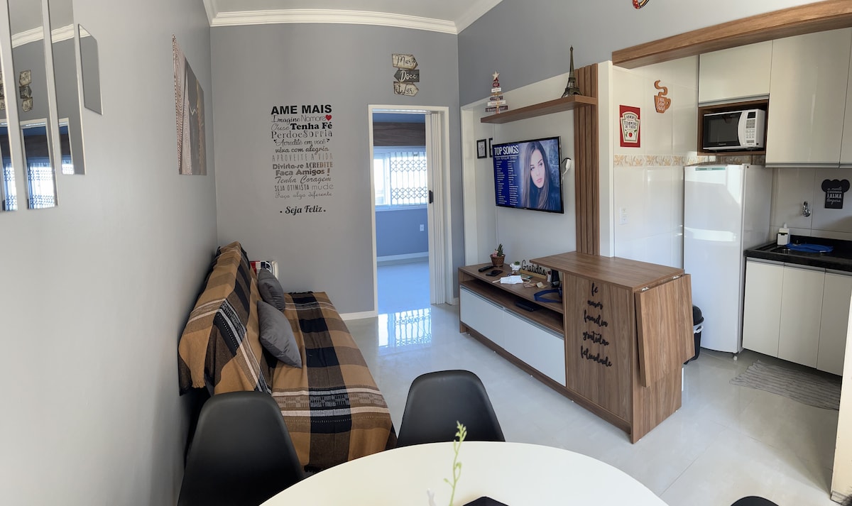Apartamento a 250m da praia, pertinho do "Eu amo Tramandaí"! Próximo de mercados, farmácia e 700m do centrinho. Ideal para casais ou famílias pequenas. Perfeito para relaxar! Garagem coberta! Conta com 1 quarto com ar-condicionado, ventilador de teto, cama queen e cama de solteiro. Sala com sofá-cama, TV e ventilador de teto. Cozinha completa com eletrodomésticos novos, lavanderia com máquina de lavar.