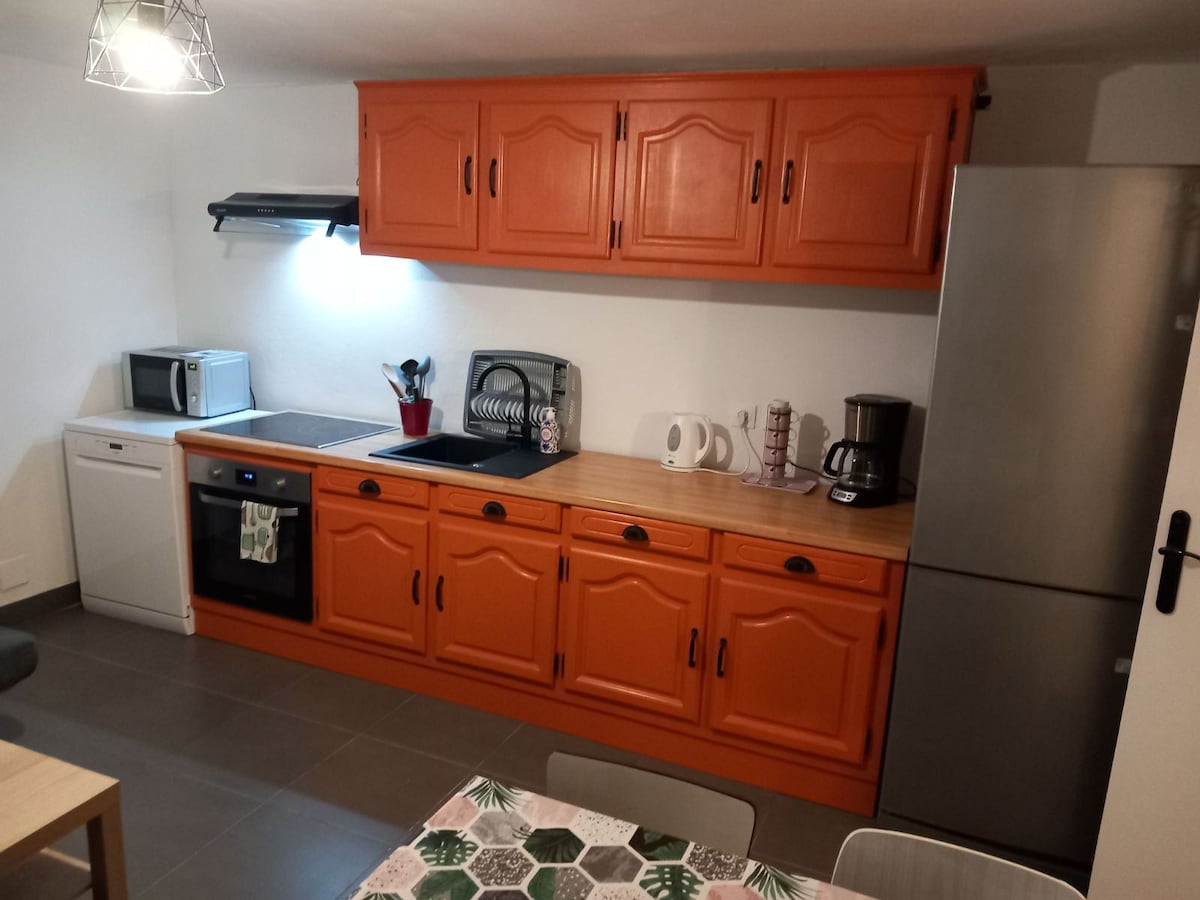 T2 rénové entièrement de 55 M2, mitoyen avec le propriétaire, à proximité des commerces, poste et gare à 900m, bien situé pour découvrir notre belle région du Sauternais Il comprend une cuisine équipée tout confort, ouverte sur le salon, salle à manger, salle d'eau avec lave-linge, Wc indépendant, chambre avec lit en 140 avec vue sur les vignes. Terrasse avec petit salon de jardin. Je vous accueille avec plaisir, Thé, dosettes de café et base d'ingrédients seront disponibles à mes voyageurs.