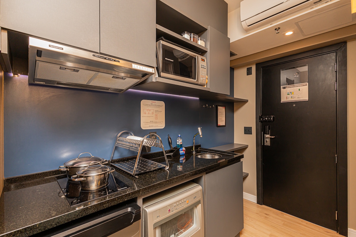 Ժամանակակից ծառայողական բնակարան Ալֆավիլի սրտում ՝ հարմարավետ հանգստի համար անհրաժեշտ բոլոր հարմարություններով ։ Ձեր այցի մեջ ներառված են հետևյալ ծառայությունները ՝ ամենօրյա մաքրում (բացառությամբ կիրակի և ազգային տոների), լողավազանի անվճար օգտագործում, թենիսի կորտ, մարզասրահ, 24 ժամյա ընդունարան: Շենքում, լրացուցիչ ծախսերի համար, կան մի քանի ռեստորաններ և լվացքատան ծառայություն ։ Քայլելու հեռավորության վրա կա 3 առևտրի կենտրոն, 2 սուպերմարկետ, հացի փուռ և հասարակական տրանսպորտ: