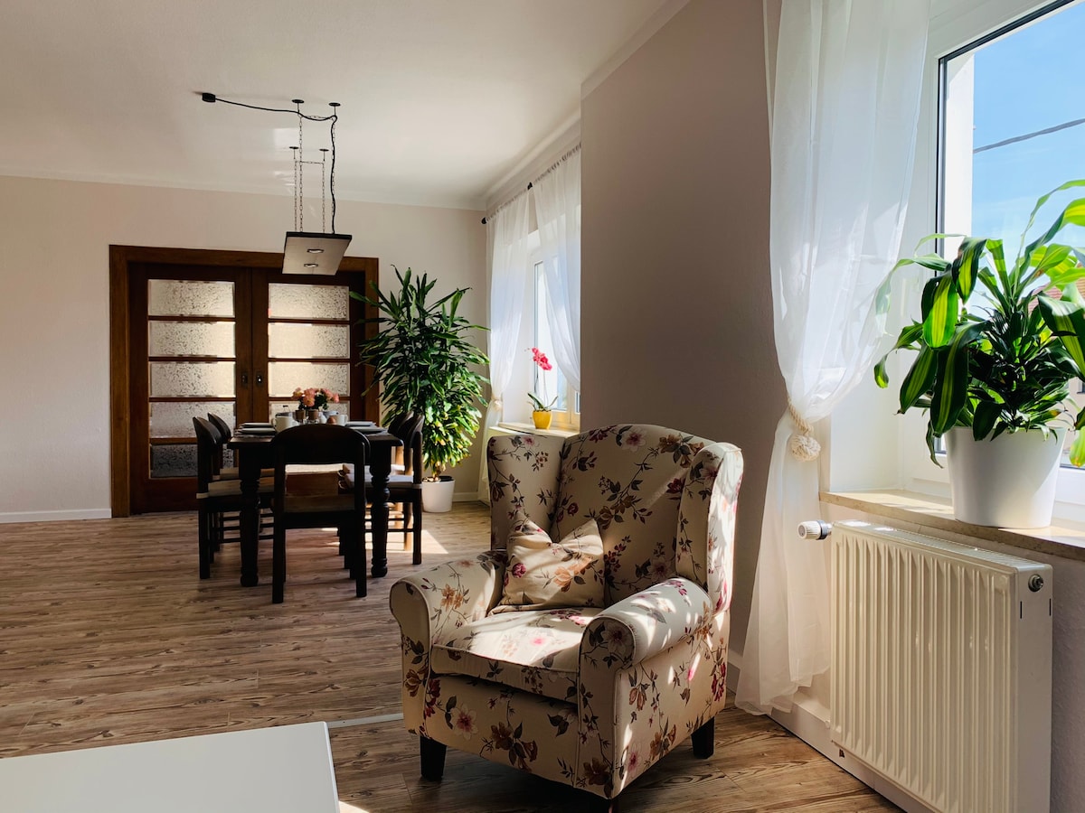 Landhaus auf zwei Ebenen mit 65qm! Wohnküche voll ausgestattet, Bad - WC, begehbare Dusche, Waschmaschine, Wäscheständer; Wohn- / Schlafkombination im offenen DG, Terrasse mit Grill, Gartennutzung nach Absprache, Stellplatz für ein Fahrzeug, Abstellmöglichkeit für Fahrräder. 2x Aufbettung möglich 20€/Nacht/Person ab 5 Jahre. Tipps für Ausflüge können bei Bedarf angefragt werden, eine Infomappe liegt aus - ansonsten verfahre ich frei nach der Devise "Alles kann, nichts muss!"