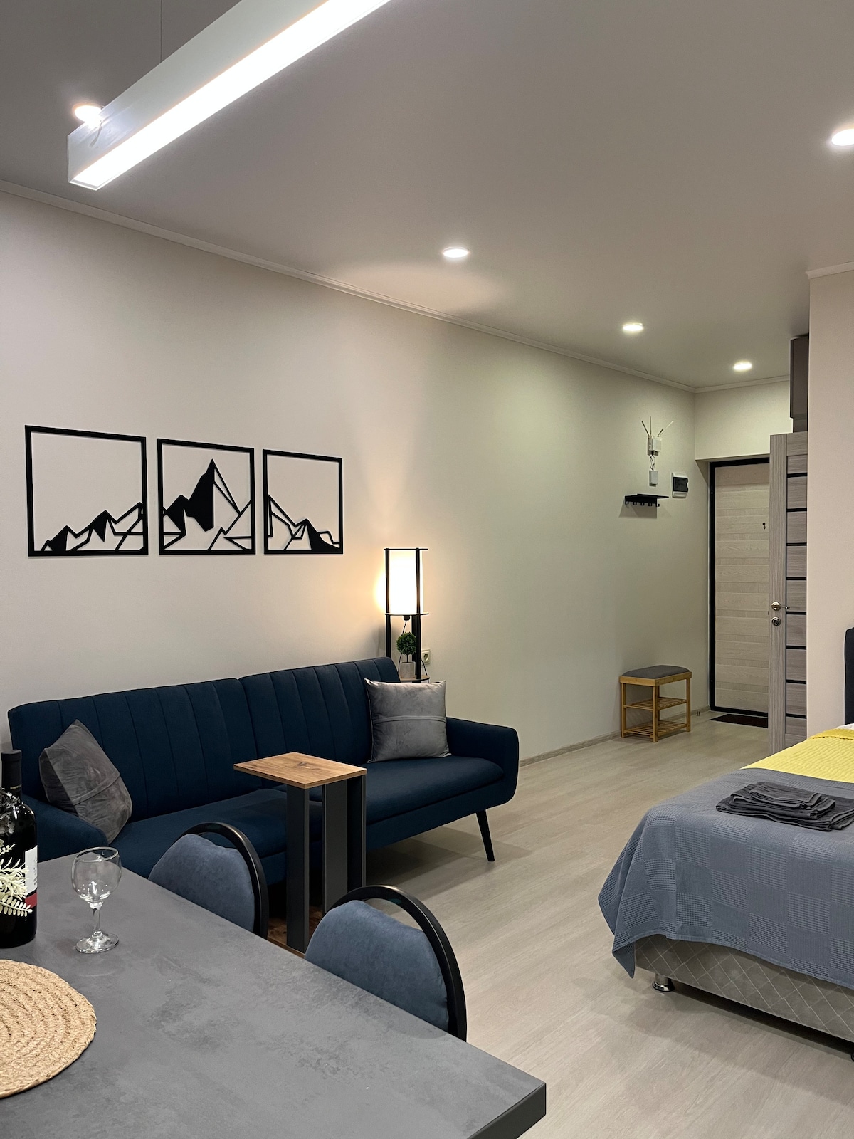 Квартира находится в жилом доме на 15 этаже (16 этажный дом), все новое в идеальном состоянии.вашем распоряжении отдельная спальня,а также студия с кухней,со спальни выход на балкон откуда открывается вид на город и горы,в студии есть раскладной удобный диван на двоих.также имеется все необходимое как на длительный так и на короткий период проживания.в доме есть супермаркет и кафе,также в 2 минутах ходьбы национальный музей.10-15 минут ходьбы до моря
