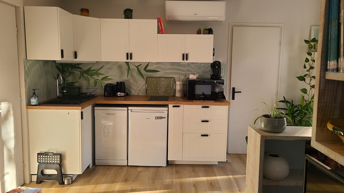 Գեղեցիկ վերանորոգված տուն ՝ պետանկեի կորտով Անկողնային սպիտակեղենը նախատեսված է 6 մահճակալի համար (սավաններ և սրբիչներ )։ Մեծ կտուր, պարտեզ 600 մ2, շատ հանգիստ և անտեսված Օպտիկամանրաթելային և անվճար Wi - Fi 1 ննջասենյակ ՝ երկտեղանի մահճակալով 2 ննջասենյակ ՝ երկու մեկտեղանի մահճակալով, 2 թախտ, գրասեղաններ ՝ ցանցային վարդակներով ։ Վայելեք մեծ հանգիստ տեռասը, որն անտեսված չէ, լուսավորված մասնավոր պետանկեի կորտի մասին, խոհանոցի և բացօթյա սեղանի մասին ։