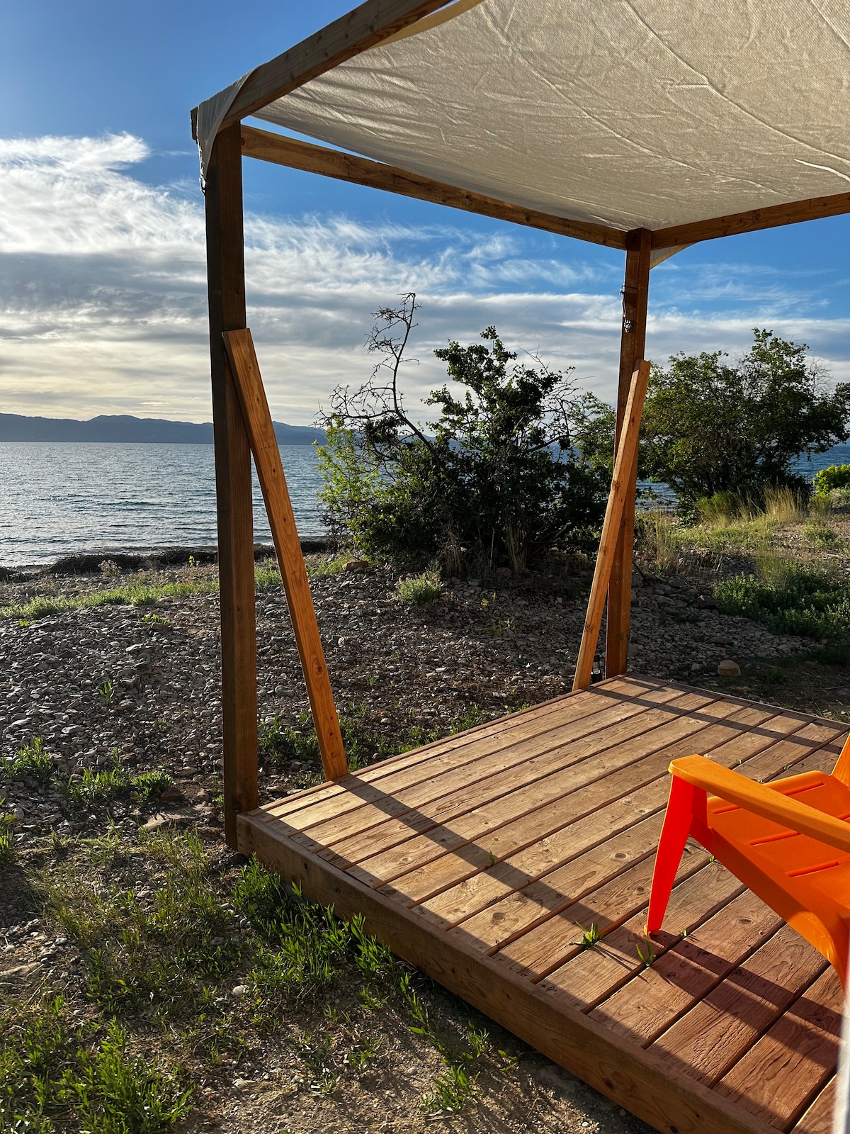Reconnect with nature at this unforgettable escape. Located at our Cisco Beach Location right on the shores of Bear lake!! Embrace the sunset from your porch area, watch the rolling waves, or take a few steps and be in the water! These are located in a primitive area. So if you are looking for a lakefront camping experience with a soft landing ( cozy beds) then we will leave the solar light on for ya!! We keep it simple for a totally different experience! Restrooms are located right next to you.