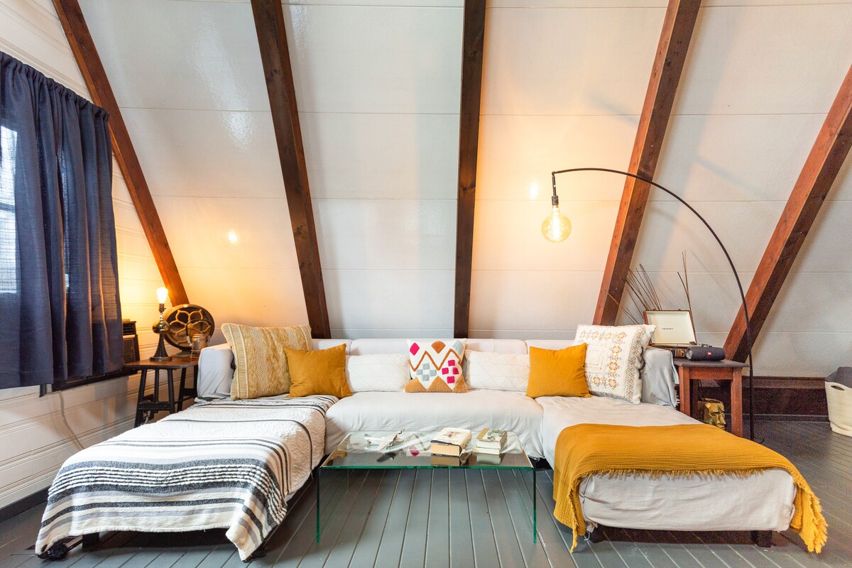 Քանդեք ոճը մեր նոր վերանորոգված եռանկյունաձև շալեում ։ Այս հարմարավետ հանգիստը հարմարավետորեն քնում է 4 մեծահասակի համար ՝ ավելի շատ տեղ ունենալու համար: Վայելեք երեկոները հետնաբակում գտնվող կրակակետի շուրջ. այն ամենը, ինչ ձեզ հարկավոր է, տրամադրվում է աստղերի տակ հանգստանալու համար ։ Ներսում ՝ ընդարձակ, անհատականացված ճաշասեղան ՝ ութ տեղ, որն առաջարկում է շատ տեղ ճաշելու, խաղեր խաղալու և պարզապես միմյանց ընկերակցությունը վայելելու համար ։