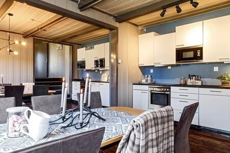 This is a modern, bright, and cozy cabin on one level, with 3 (4 bedrooms), 8 beds, and everything you need for a pleasant stay in the mountains. Two of the bedrooms have fold-down desks - perfect for workation. The modern fireplace will provide both comfort and warmth after a long day in the fresh mountain air. Electricity (ex. EV charging) included in the rent. The cabin is new, from 2022.