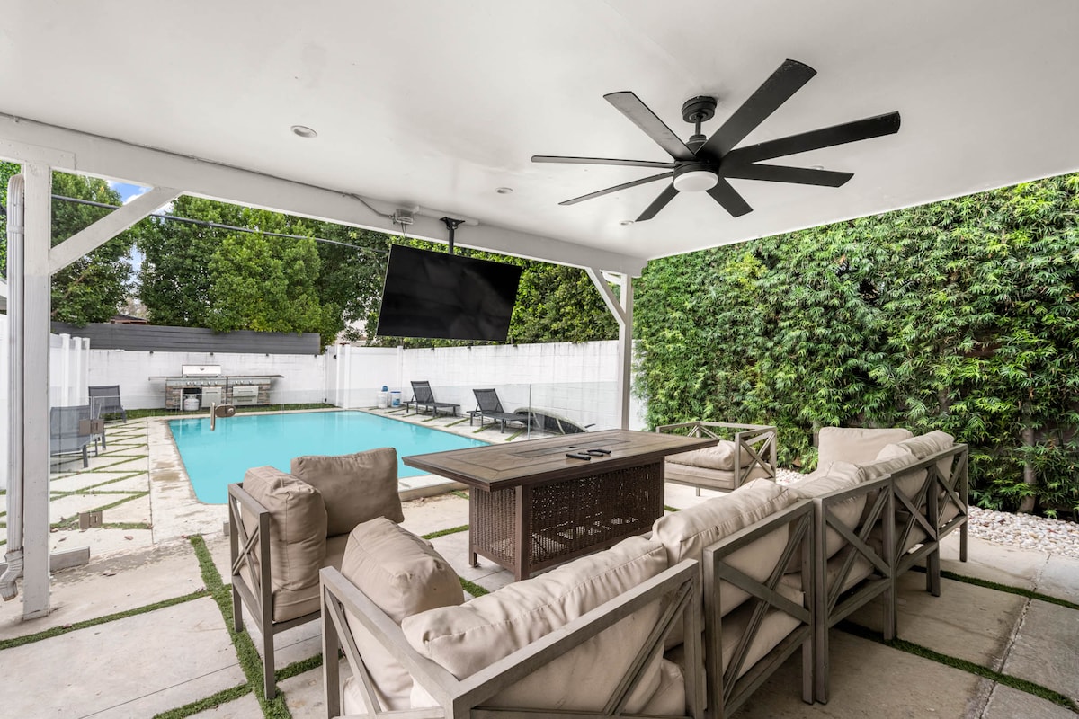 LA Dream Home with hot tub, al fresco dining, fire pit, & movie room! ★ "Great stay. Wonderful clean home up in the hills. Close to everything." ☞ Patio w/ firepit + BBQ + hot tub ☞ Game room w/ pool table + darts ☞ Master suite w/ king + soaking tub ☞ Hybrid memory foam mattress (soft/firm) ☞ 60” smart TV + movie projector ☞ Marshall speaker + Alexa w/ spotify ☞ Private backyard + pet friendly* ☞ 1000 Mbps wifi 8 mins → DT West Hollywood 10 mins → DT Hollywood + Universal Studios **NO PARTI
