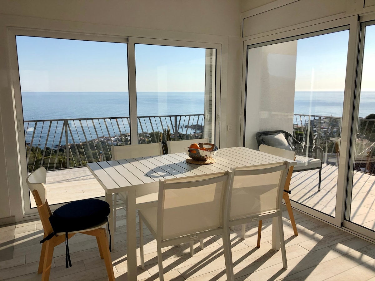 75m2 loft apartment with modern and unique architecture. Carefully designed, decorated with vintage-style furniture and art carefully selected over the years. This combination, along with a spectacular and impressive view over the bay of Cadaqués, makes it absolutely unique. It is located just 1 minute walk from Es Poal beach, about 45m away. PET friendly. We love animals. Please inquire privately about the extra cost per night for your adorable and furry friend.