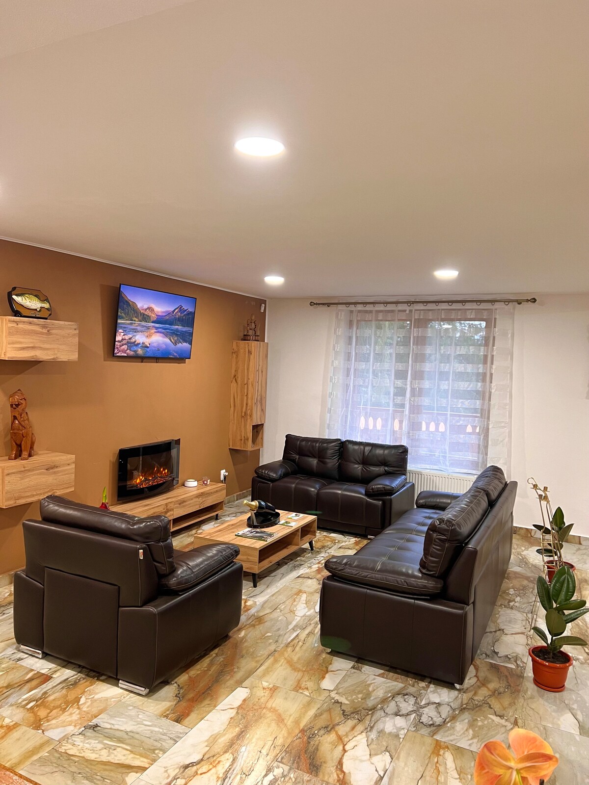 Ուրախ 5 ննջասենյակով վիլլա ՝ ներսի հրդեհի վայրով