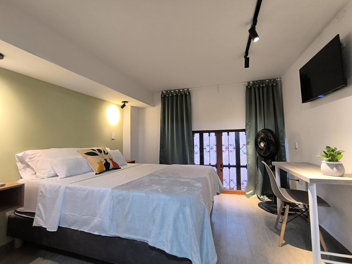 Habitación privada cómoda y bien ubicada en el corazón histórico de Cali, ideal para viajeros que desean explorar a pie. Cuenta con baño privado, ventilador, TV, escritorio, WiFi y cocineta equipada con microondas, cafetera y nevera. A media cuadra del Boulevard del Río, cerca de más de 5 museos, la Calle del Sabor, restaurantes, bares y el Gato de Tejada. Ubicación estratégica en zona turística, cultural y gastronómica.