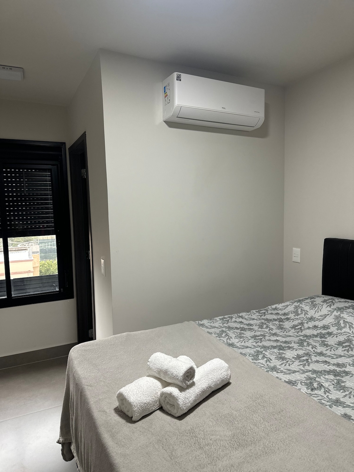 Flat confortável c/ mobiliário novo. Cozinha e sala integradas c/ sofá em L, mesa de trabalho, bancada c/ cadeiras, cama queen, ar condic. no quarto. Fornecimento de berço e banheira c/custo adicional. Cozinha equipada c/ cooktop, coifa, forno elétrico, microondas, geladeira, cafeteira nespresso e de coador, liquidificador, misteira e utensílios domésticos. TV SKY c/ 283 canais, wi-fi velocidade 500mb grátis. No bairro há vários supermercados, farmácias, cafeterias, restaurantes e shoppings.