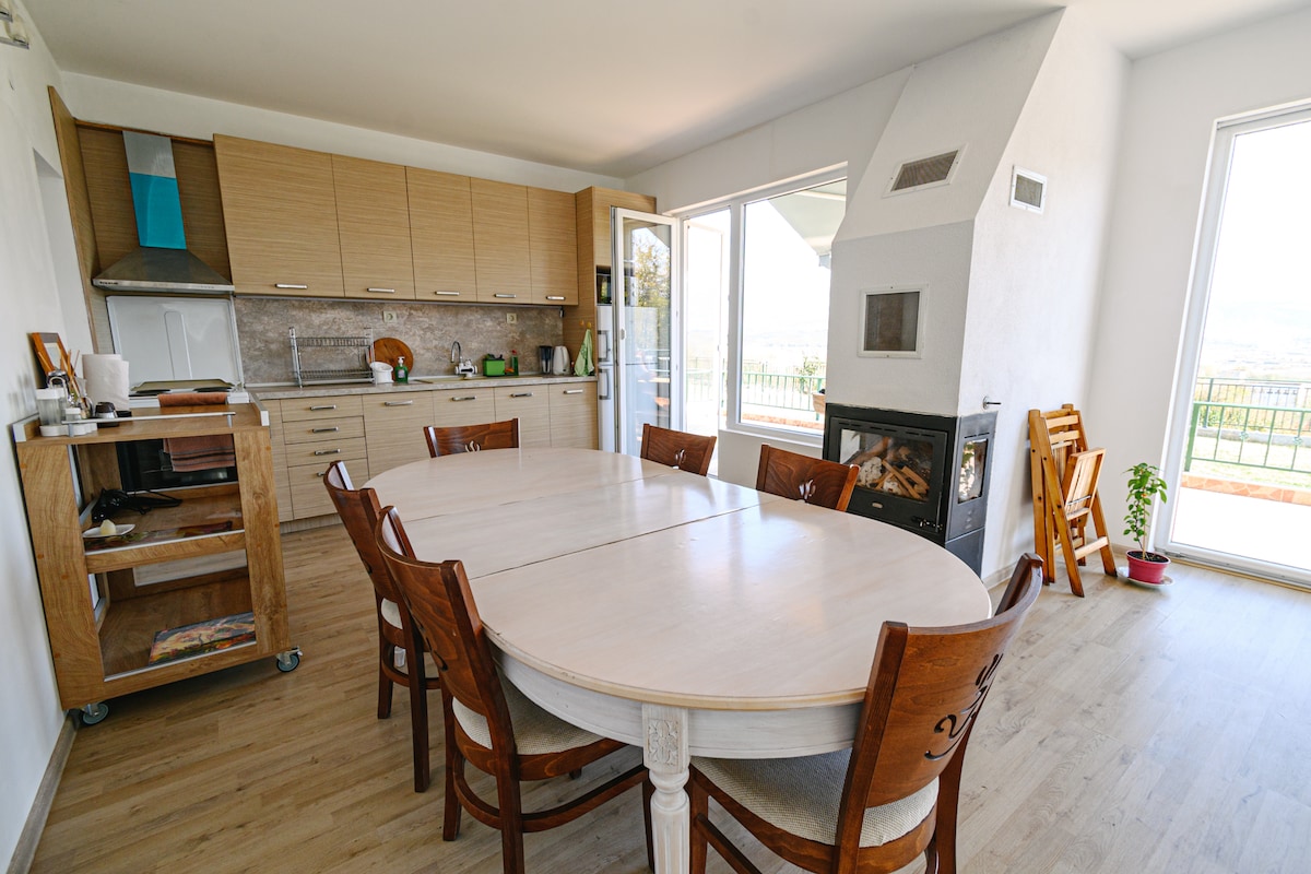 5 km from Blagoevgrad. The villa has amazing view of the whole city and the mountains Rila and Pirin. Absolute privacy, there are no other houses nearby. The house has 3 bedrooms with double beds. Air conditioners in every bedroom and living room. Beautiful fireplace. Sauna. Jacuzzi. Strong Wi-fi. TV. More than 50 board games for adults and kids. Outdoor barbeque. Outdoor games - football, federball and MANY more. Trampoline and swings for kids and lots of activities. Outdoor gym and a Chapel.
