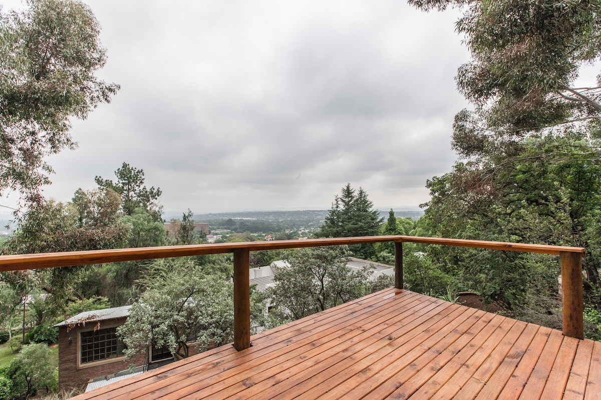 This centrally located, self catering, free-standing, magical mountainside cottage, exudes charm and a spirit of adventure. Perched on the ridge, it looks out over Johannesburg's northern suburbs and is set in a spacious garden full of botanical delights, birds and butterflies. This is a quiet, peaceful area suitable for relaxing or working from. We have a solar and battery power backup and water reservoir, so have reserves of electricity and water.