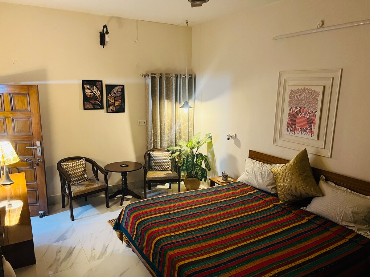 Բարի գալուստ երկրորդ հարկում գտնվող մեր հարմարավետ պենտհաուս ՝ առանձին մուտքով և հմայիչ պատիոյով ։ Տունն առաջարկում է 2 օդորակիչով ննջասենյակ ՝ յուրաքանչյուրը մեծ մահճակալով, 2 լոգասենյակով (մեկը կցված է, մեկը ՝ հյուրասենյակում), RO ջրի զտիչով խոհանոց և սառնարանով փոքր ընդհանուր տարածք ։ Տրամադրվում են նաև գերարագ Airtel Wi - Fi և աշխատանքային գրասեղան ։ Խնդրում ենք նկատի ունենալ. եթե ամրագրեք 1 -2 հյուրի համար, 1 ննջասենյակը և լոգասենյակը փակ կմնան ավելի հարմարեցված փորձառության համար ։