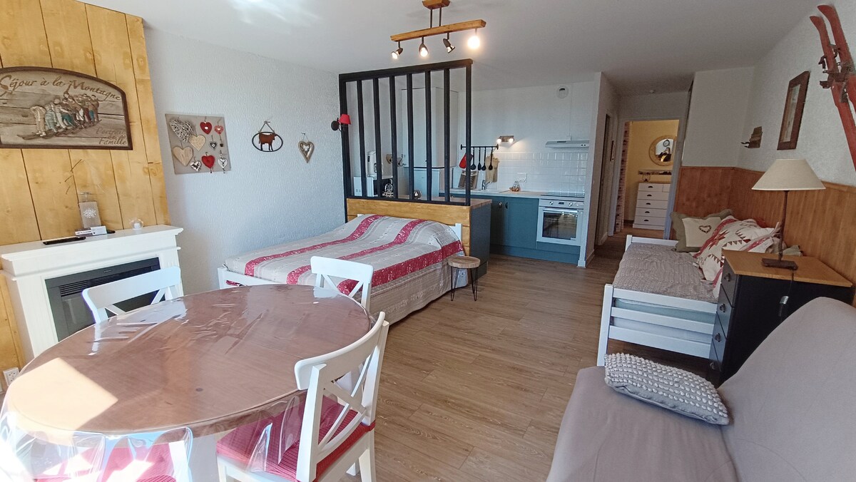 Situé dans la résidence Les Chalets de Superbesse, appartement de 33 m2, au 5 ème étage, accessible par ascenseur et escalier, avec balcon exposé sud. Il comprend : - une pièce principale avec coin cuisine tout équipée et coin salon avec canapé convertible ( 2x1 personne ) - une chambre avec lit 140 cm et placard encastré - un WC séparé - une salle de bain avec baignoire - un balcon de 9 m2 avec mobilier de jardin - un local à ski/rangement privatif