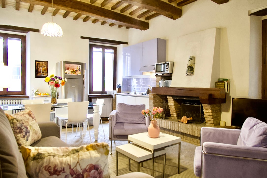 Մեծ բնակարան հնագույն շենքում պատմական կենտրոնում Perugia, մոտ համալսարանի. Բնակարանը լուսավոր է և արևոտ, որտեղից հիանալի տեսարան է բացվում դեպի Պերուջայի պատմական կենտրոնը և շրջակա բլուրները ։ Այն կարող է հարմարավետորեն հյուրընկալել վեց մեծահասակի (չորս սենյակներում ՝ երկու երկտեղանի և երկու մեկտեղանի) և մանկահասակ երեխայի (օրորոց, որը տրամադրվում է ըստ պահանջի, կարող է տեղադրվել ննջասենյակում կամ ընդհանուր տարածքներում )։ Արագ, անսահմանափակ ինտերնետ: