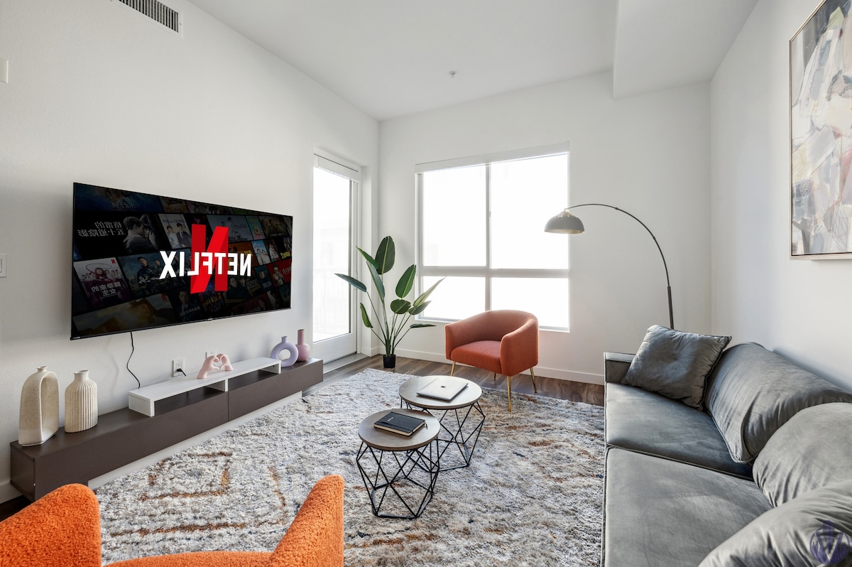 Private balcony cozy apartment ! -Balcony. -Gated garage reserved parking included. -Work space in the apartment. -Pool & Jacuzzi. -Gym 24/7. Queen size MEMORY FOAM BED & stylish sofa! TV in the apartment: Rotating from Living room to Bedroom. Spacious shower with essentials and large bathtub. Fully equipped brand new kitchen with dishwasher. In-unit Washer and dryer with detergent. PROFESSIONALLY DEEP CLEANED & SANITIZED BEFORE EACH CHECK IN!