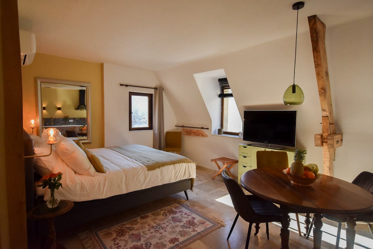 Նվիրված է հատկապես սիրահարներին ։ Եկեք և բացահայտեք կամ վերագտնեք Դորդոնի հովտի ամենաէկզոտիկ և զարմանալի գյուղում գտնվող Պերիգորդ Նուարը, լողափը և տարածաշրջանի ամենահայտնի տեսարժան վայրերը ձեր ձեռքի տակ: Գտնվելով պատմական շենքում, գյուղի սրտում և ափամերձ գոտում ՝ այս յուրահատուկ լոֆթը ձեզ առաջարկում է կլոր մահճակալ ՝ 2.30 մ տրամագծով, մասնավոր սպա և Դորդոնի ու նրա հովտի անհավանական տեսարան...