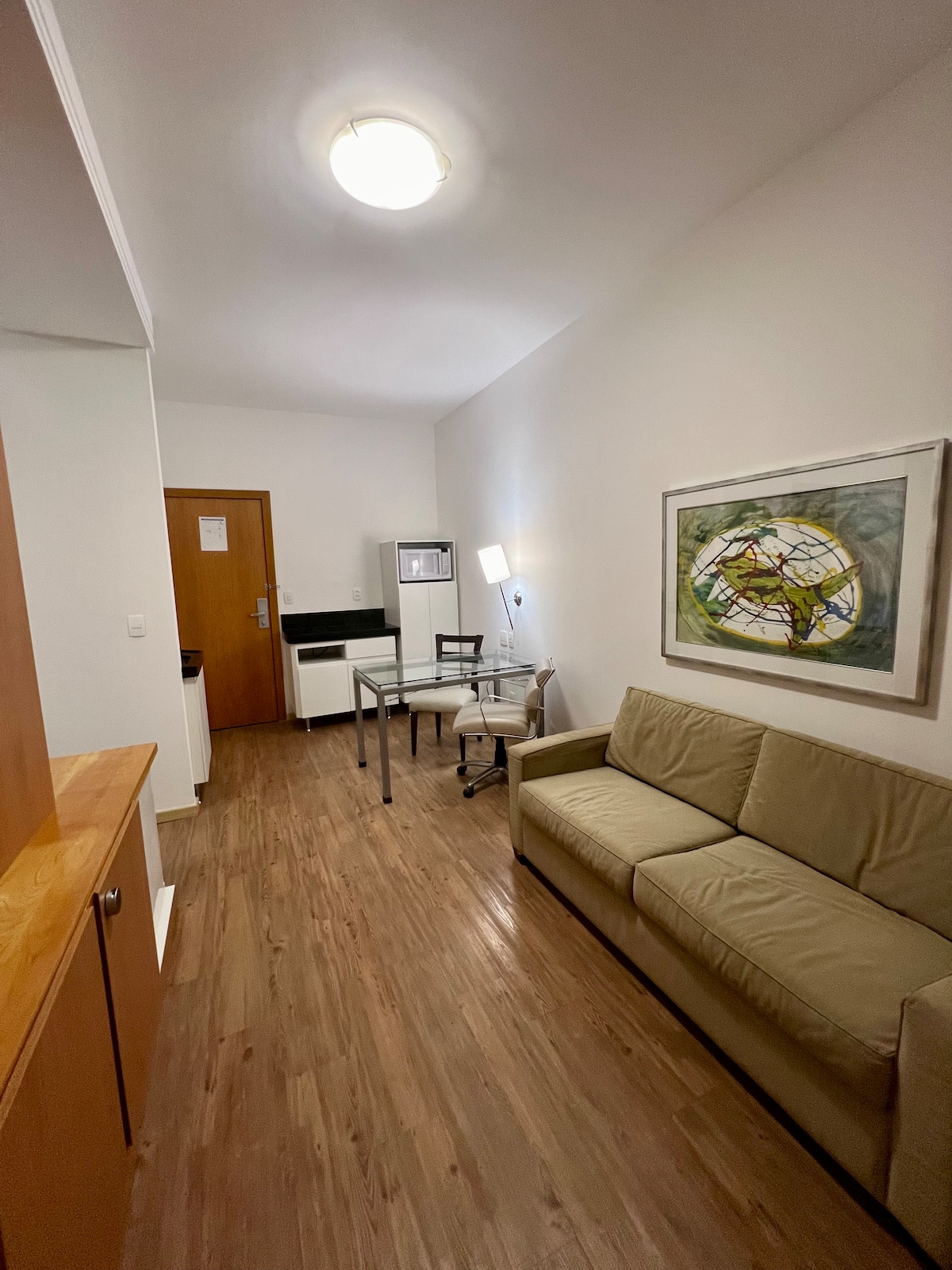 Excelente apartamento, reformado, para quem quer privacidade e independência, no coração da Savassi a três quadras da Praça da Liberdade e do Shopping Pátio Savassi. Suite e sala com ar condicionado split, wifi por fibra velocidade de 500 megas, tv a cabo na sala e quarto, fogão por indução, microondas, forno elétrico, frigobar, máquina de café nespresso, decorado com bom gosto, serviço de camareira diariamente, vaga de garagem, piscina , academia, sauna, restaurante e portaria 24horas.