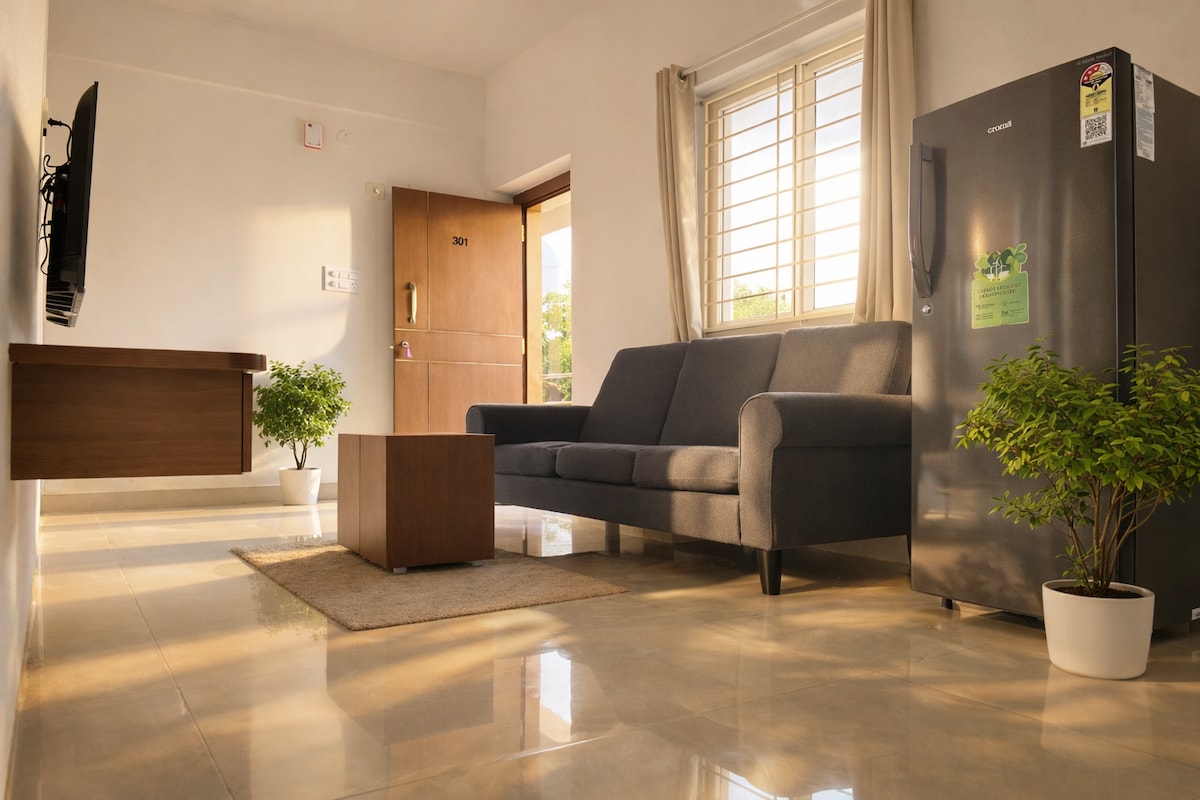 Strictly Unmarried couples not allowed. Relax with the Executive and a peaceful place to stay. The impressive Garden View welcomes you to this Flat. Once inside, the 4k TV and Sofa set in the hall makes it perfect for Movies and relaxation. Dedicated Work station perfect for your work with seamless wifi connection. You have a Simple and kitchen to your Left, One bedroom and one bathroom. You can Have a great View of the Garden, enjoy the stay with a luxurious Garden View.