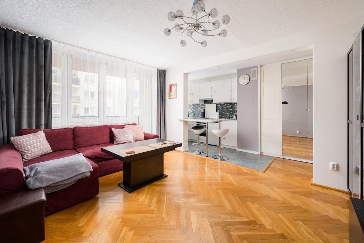 Modern, fully equipped apartment with a balcony on a closed estate with a playground. A perfect location - Wesfield Arkadia shopping mall, Klif, Powazki, Fabryka Koronek, restaurants and more nearby! Tram stop just around the corner, from which you can reach the very centre in 20 minutes. The apartment has a comfortable sofa bed, a kitchenette with dinner table and a bathroom with washing machine. High-speed Wi-Fi, smart TV and a parking space in the underground garage are provided :)