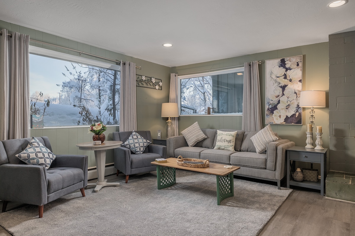 Enjoy the peace and tranquility of the Lucille Lake Lucille! This newly renovated lakefront home has awe-inspiring lake and mountain views from almost every room in the house. Located in Wasilla, AK next door to the Best Western and Chophouse, this 3,000 sq. ft. home features 3 floors of living space, sleeping accommodations for 14, fully equipped kitchen, smart TV's, washer and dryer, outdoor BBQ, game room in garage and private dock.