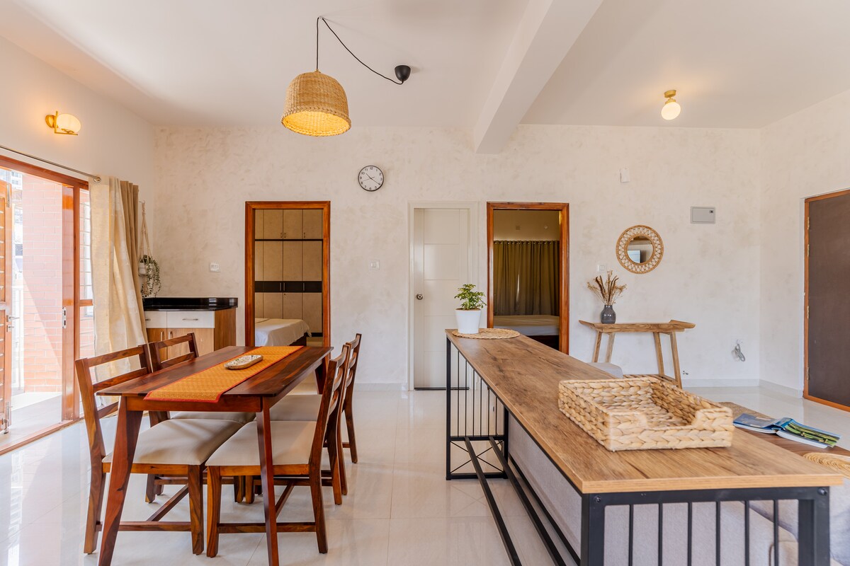 A bright, spacious 4BHK wrapped in greenery—perfect for families, group stays & peaceful work trips. Enjoy cozy bedrooms, balcony coffee moments, foosball/board games, and a fully equipped kitchen for easy, comfortable stays. Clean, calm and inviting—designed for a restful experience. Includes 65” Smart TV + Netflix, fast Wi-Fi and a sunny green-view balcony. ⚠️ No parties / no loud music. Quiet hours after 10 PM. ⚠️ Only confirmed guests may stay overnight. 🐾 Pets only with prior approval.