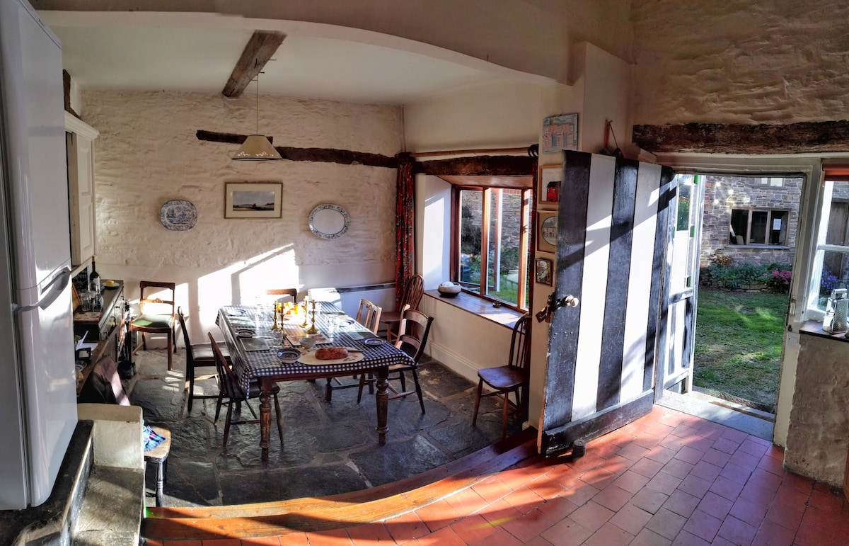 Restored old building on medieval site, on edge of the Shropshire Hills AOB, in quiet location in central Bishop's Castle. Double and single bedrooms, lovely old furniture, luxurious modern comfort, well-equipped kitchen with dishwasher; walk-in shower downstairs, bathroom upstairs; centrally heated plus log-burner; wi-fi and television. Sleeps up to three adults or two adults and a child. Dogs welcome downstairs. Off street parking, electric charging point and private courtyard.