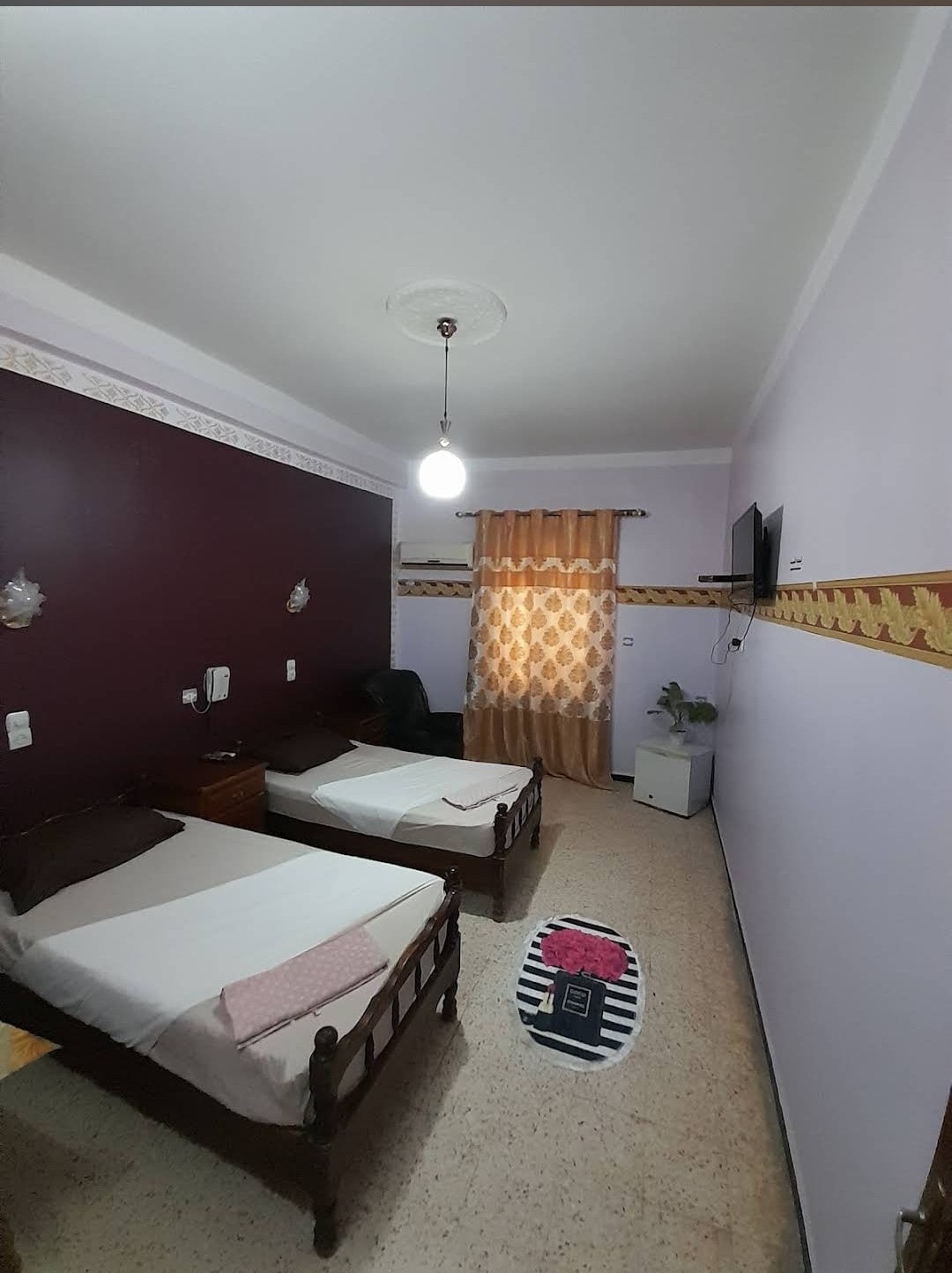 Ժամանակակից բնակարան, որը գտնվում է հանգիստ և ապահով տարածքում ՝ քաղաքի կենտրոնին մոտ ։ Այն բաղկացած է երեք սենյակից և հագեցած է բոլոր անհրաժեշտ պարագաներով, ինչպիսիք են սառնարանը, գազօջախը, վարագույրը, օդորակիչը, ջրատաքացուցիչը, հեռուստացույցը, հինգ հարմարավետ մահճակալները, անվտանգության բարերը, ջեռուցումը, կտուրը և երկու պահարանները: Անվտանգությունն ու հարմարավետությունը երաշխավորված են այնտեղ ապրողների համար ։ Այն բավականաչափ ընդարձակ է ընտանիք ընդունելու համար ։