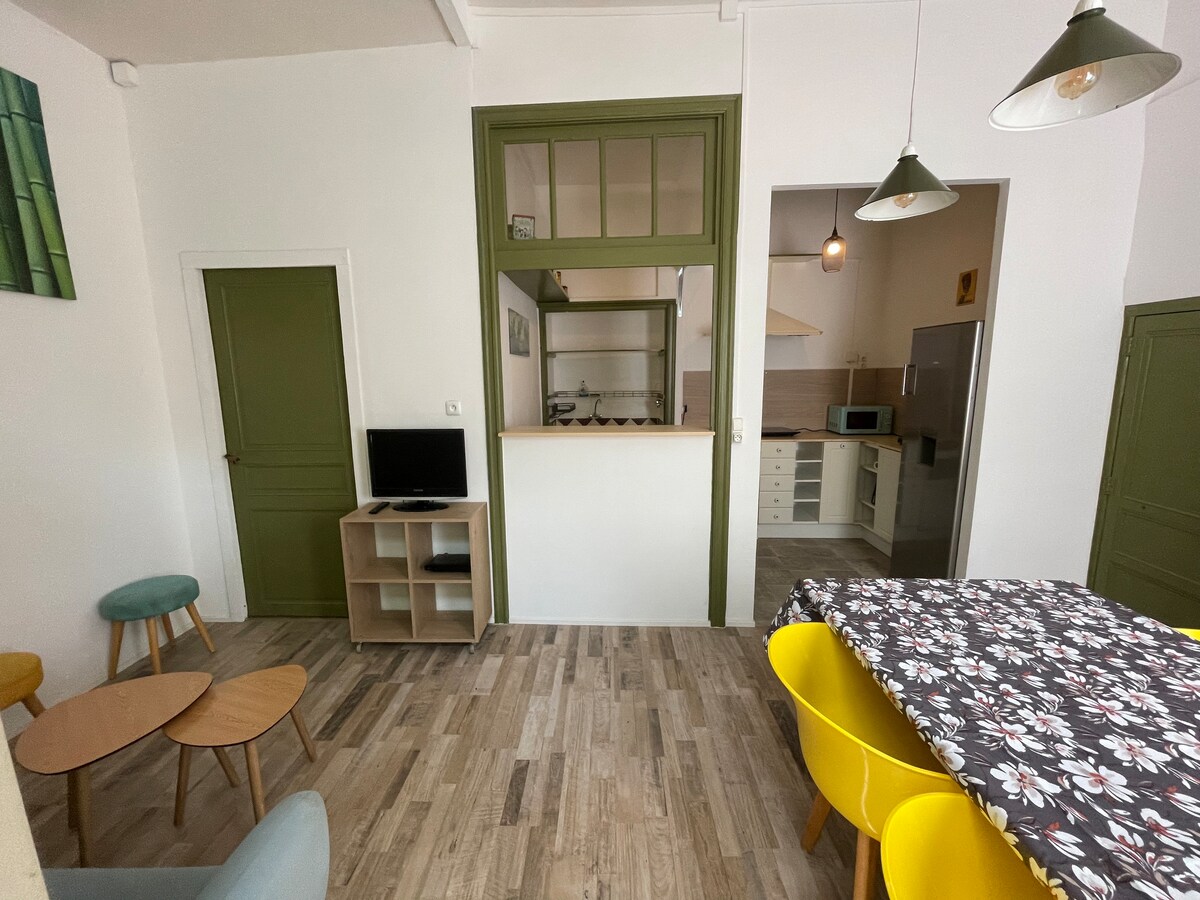 Studio climatisé chaleureux et propre, tout confort, trés calme de 21 M2 avec entrée indépendante sans promiscuité. Café d’accueil, expresso, thé, eau minérale,madeleines,lait,beurre,croissant, confiture,micro onde, Vélo en prêt à votre disposition Proche du célébre restaurant LES GRANDS BUFFETS, zoo,du centre ville et des plages. Parking à 10 m pour votre véhicule (garage pour moto) Bus à proximité pour le centre ville. Une télévision 32" à votre disposition dans le studio.