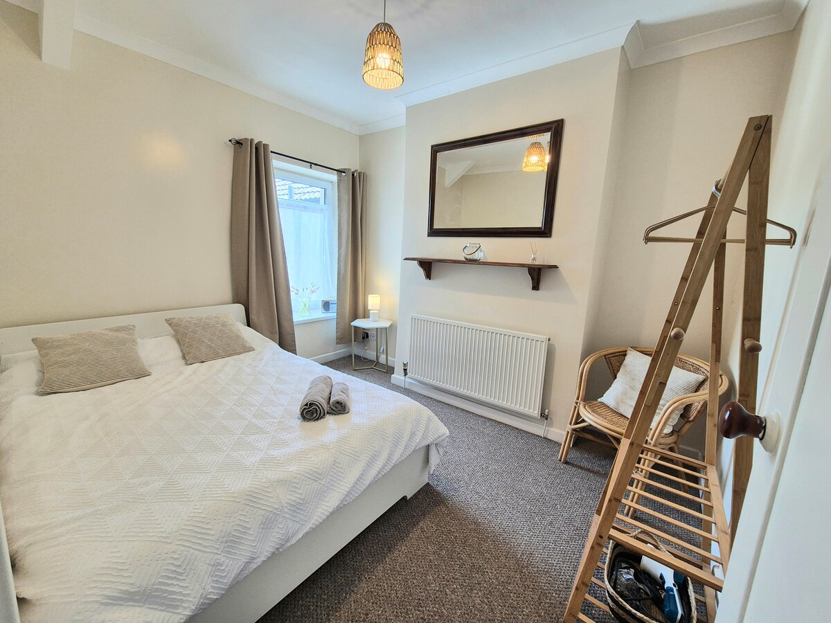 Հակառակ կողմը Caerphilly Castle. Self պարունակվող մասնավոր հավելված, մեծ սենյակ, Garden View - ով: En Suite ցնցուղ + WC, 2 մեկտեղանոց մահճակալներ, գերարագ WiFi: Բարձր առաստաղ. Օգտագործեք Garden, Portable Air Con Հեշտ է գտնել Որտեղից, Փողոցում Ավտոկանգառ, Town Centre & Supermarket Walkable, Այցելուների կենտրոն, Pubs եւ ռեստորաններ. Uber Ride /Առաքում, 2 երկաթուղային կայարաններ և ավտոբուսային երթուղիներ: Զբոսայգի և սպորտային դաշտ PT - ի,Վազքի բացօթյա մարզասրահի,թենիսի կորտ, հանգիստ տարածքի համար: Գնացք դեպի Քարդիֆ 25mins յուրաքանչյուր 30mins Փոստի Office walkable