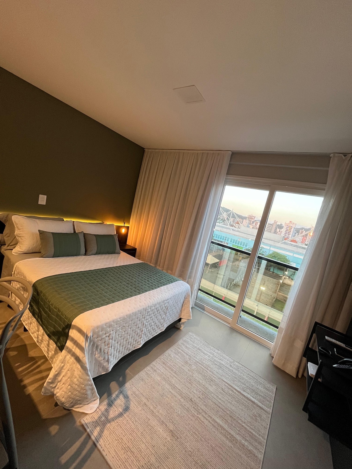 Beautiful studio apartment with garage, in the center of Blumenau, near everything! Building has a gym and an incredible rooftop pool. The apartment is complete and very stylish. Double bed, sheets, covers, pillows, bath towels, AC. Full kitchen with refrigerator, microwave and tableware for 2. Laundry with iron table and iron.