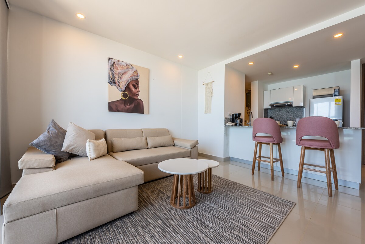 Perfecta para parejas. Tiene 2 baños y 1 alcoba, sala con cocina abierta y zona de lavandería: lavadora/secadora. Además, Wifi, TV y A/C, agua caliente. Está directamente en la playa de "Bocagrande" con vistas increibles hacia el mar abierto y la "ciudad amurallada". Cuenta con una zona común con piscina panoramica, gym, sauna y jacuzzi. Parking gratuito.
